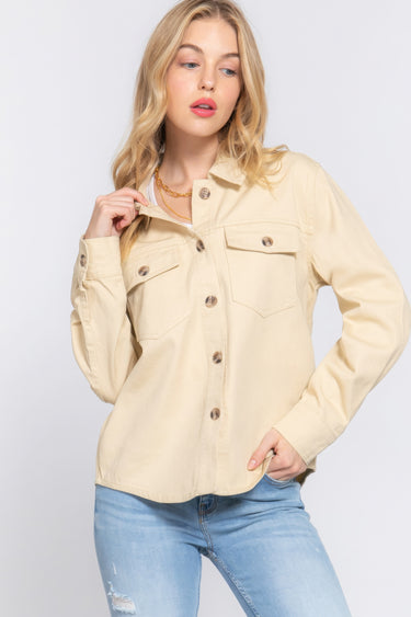 Elevate your wardrobe with our Button Down Cotton Denim Shacket in sophisticated taupe. Add versatility and timeless style to your look with this essential piece!