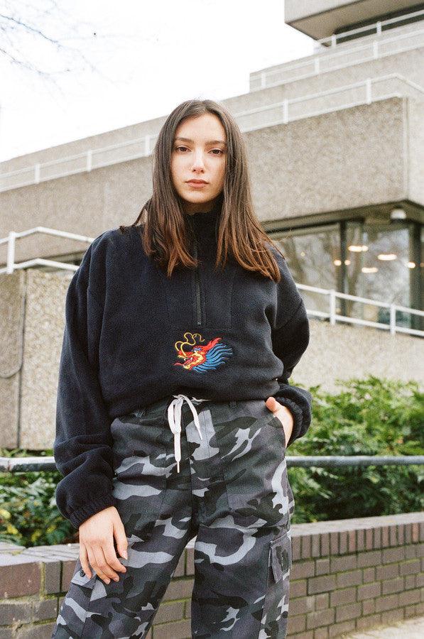 This cosy fleece features embroidery with a Chinese dragon design on the front as well as label detailing on the hem, fleece-lined pockets and an adjustable waistband for extra warmth!