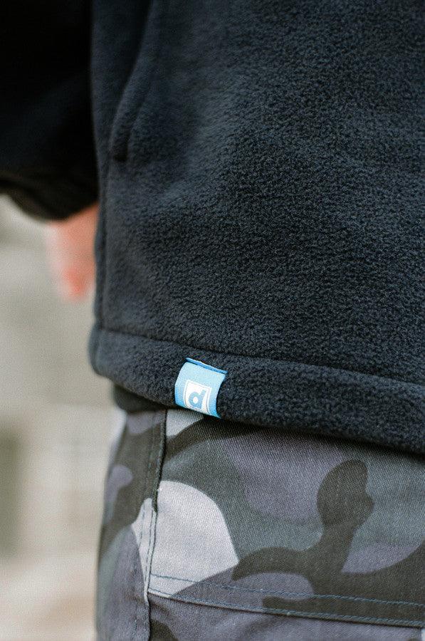 - Woven label details at bottom of fleece and inside the collar