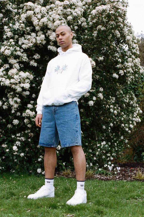 Our Tropical palm tree hoodie has front and back prints, including woven label details at bottom of hoodie and inside collar. Keep the good vibes going with our wavy palm tree print, make summer last.