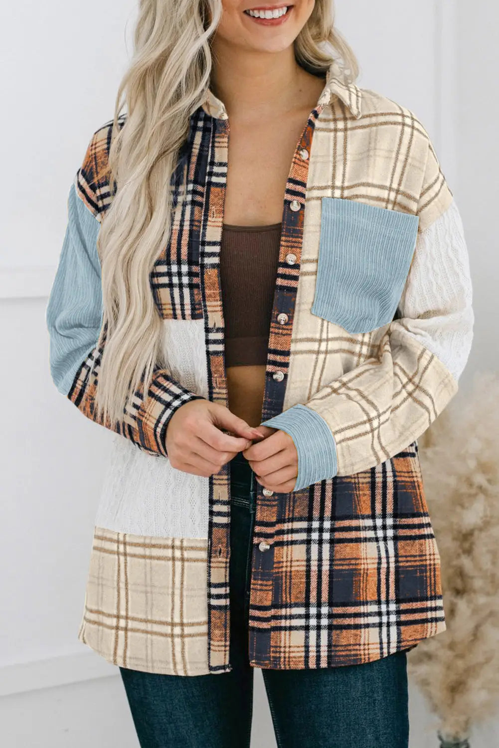 Khaki Plaid Color Block Patchwork Shirt Jacket with Pocket