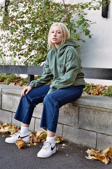 - Woven label details at bottom of hoodie and inside the collar