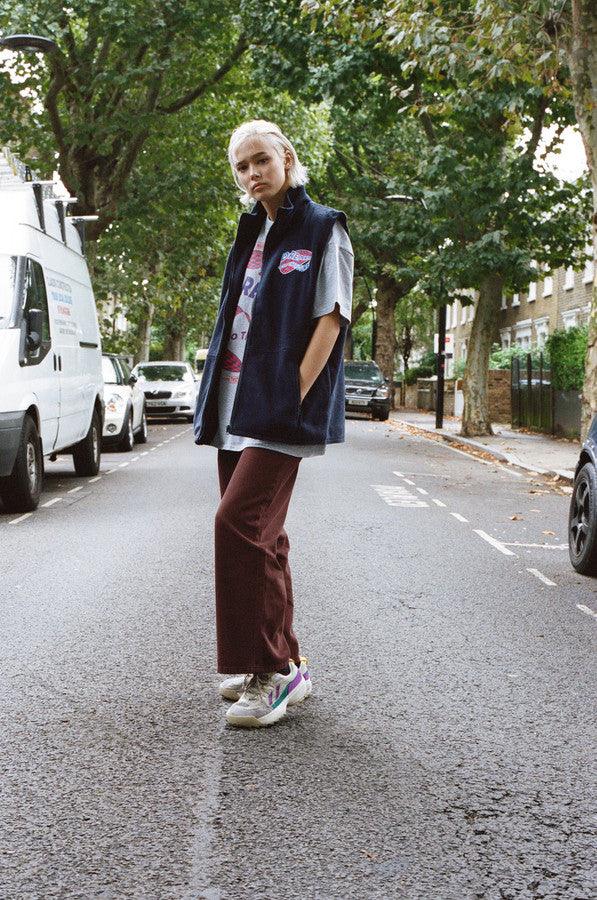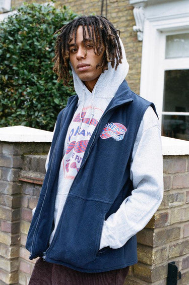 Another addition to the AW18 drop inspired by the 90s rave culture. This embroidered navy blue fleece gilet captures that state of mind late at night or early morning when perspectives are warped and distortions are twisted.