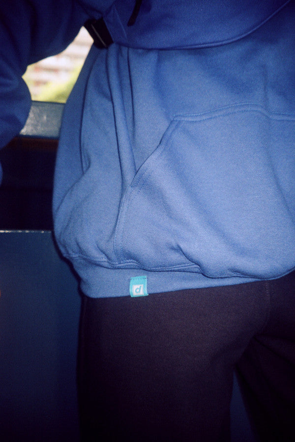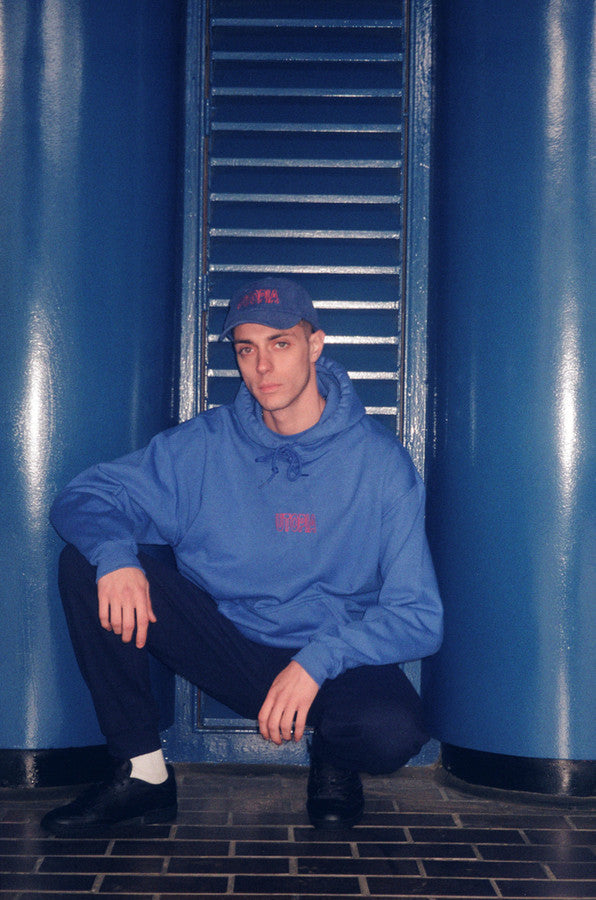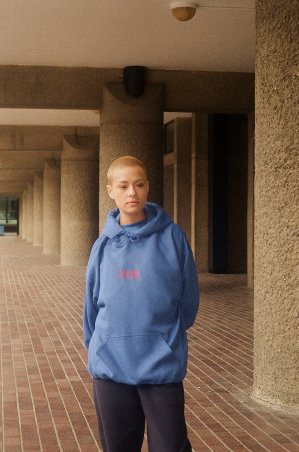 This hoodie from the Blue Utopia collection features an embroidery with the text 'Utopia' on the front as well as label detailing on the hem Everything from the collection has been designed and printed in our South East London studio.