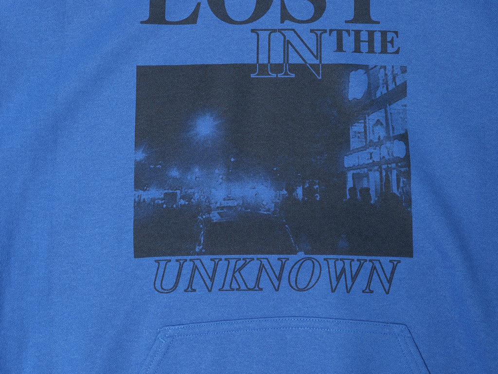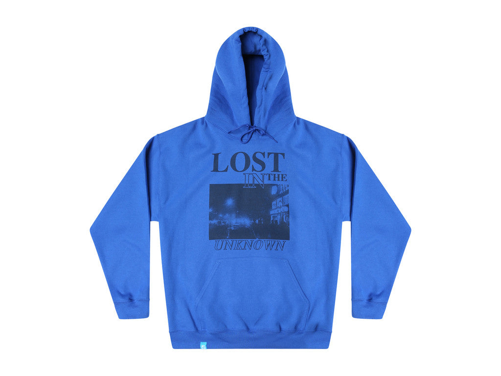 - 'Lost In The Unknown' Design printed on the front of a royal blue hoodie