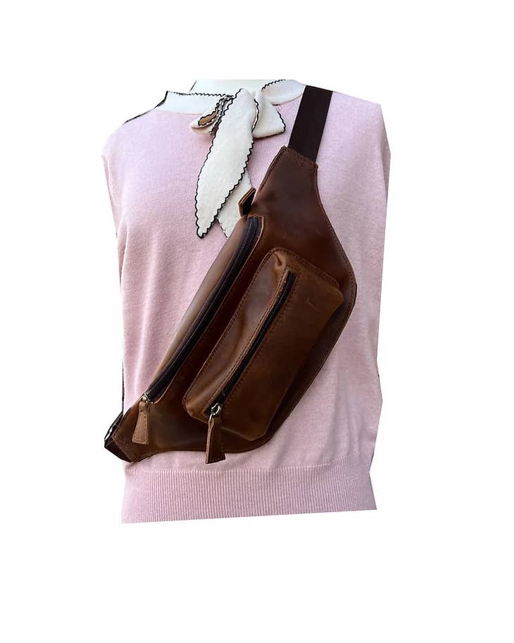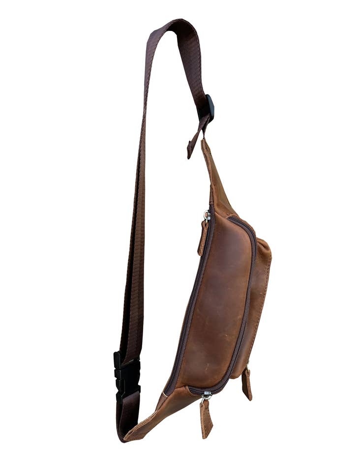 Lightweight crazy horse genuine leather unisex bag with durable lining and leather zipper puller. There is one zipper pock on top and front and another zipper pocket on the back. It can fit your phone, keys, wallets, and other essentials. The adjustable strap allows you to wear it as a fanny pack, sling bag, or shoulder bag. It’s a good choice for your traveling, party.- Adjustable nylon waist strap with buckle