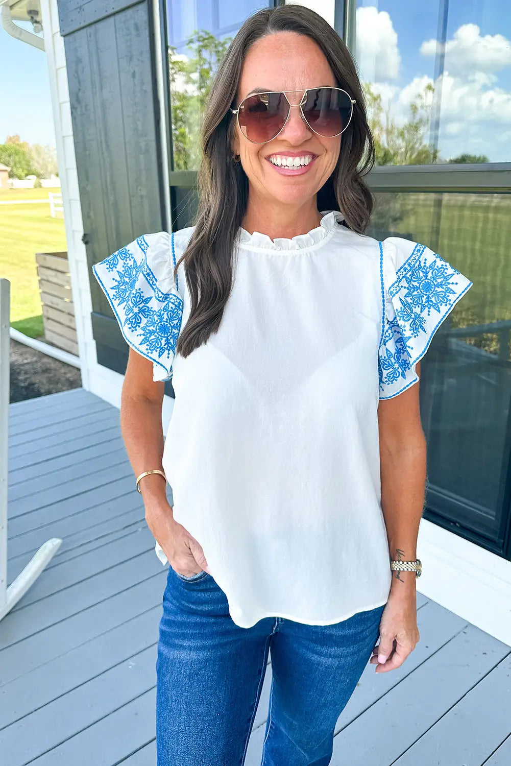 - Belle Blouse - White Embroidered Ruffled Sleeve Frilled Collar