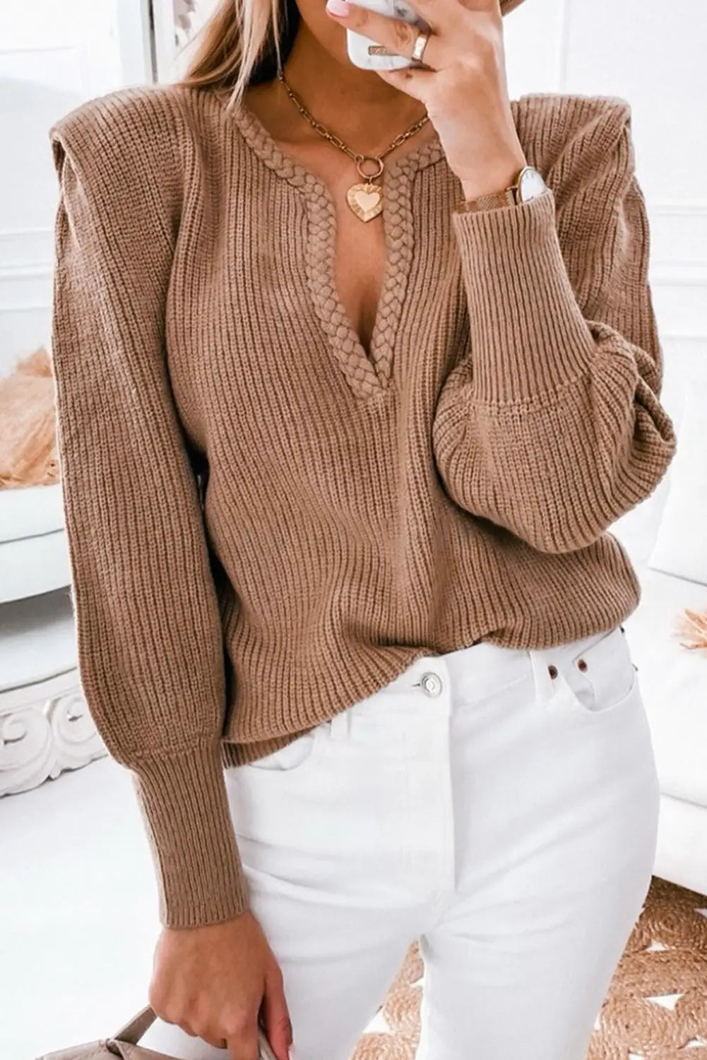 The V-neckline adds a subtle hint of femininity alongside a dramatic, elegant puff sleeve adorned with braided detailing for a touch of sophistication. Crafted with a high-quality knitted fabric, this classic sweater boasts a soft and comforting feel, while its flattering silhouette complements all body types.