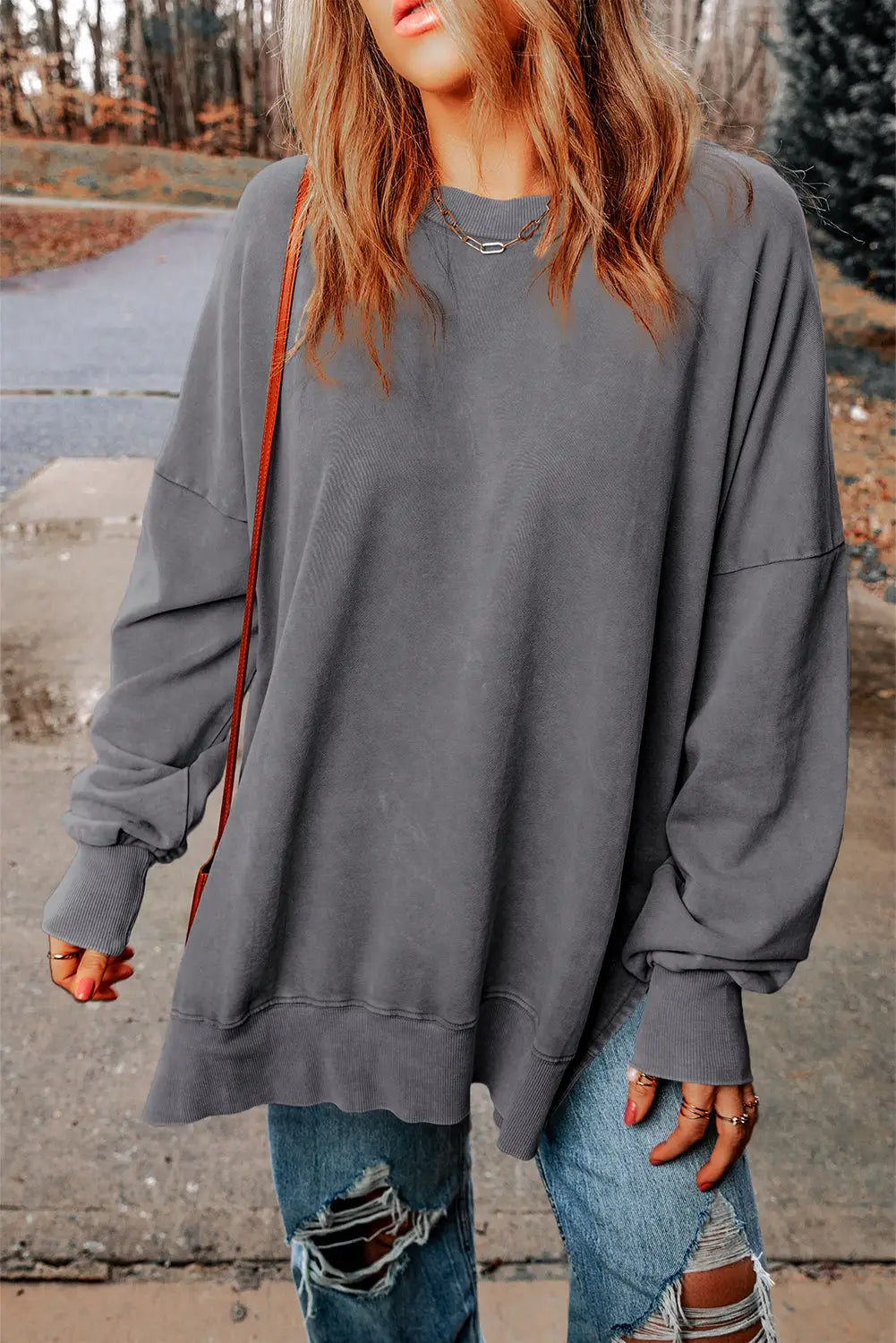 • The loose sweatshirt is adorned with stylish bishop sleeves