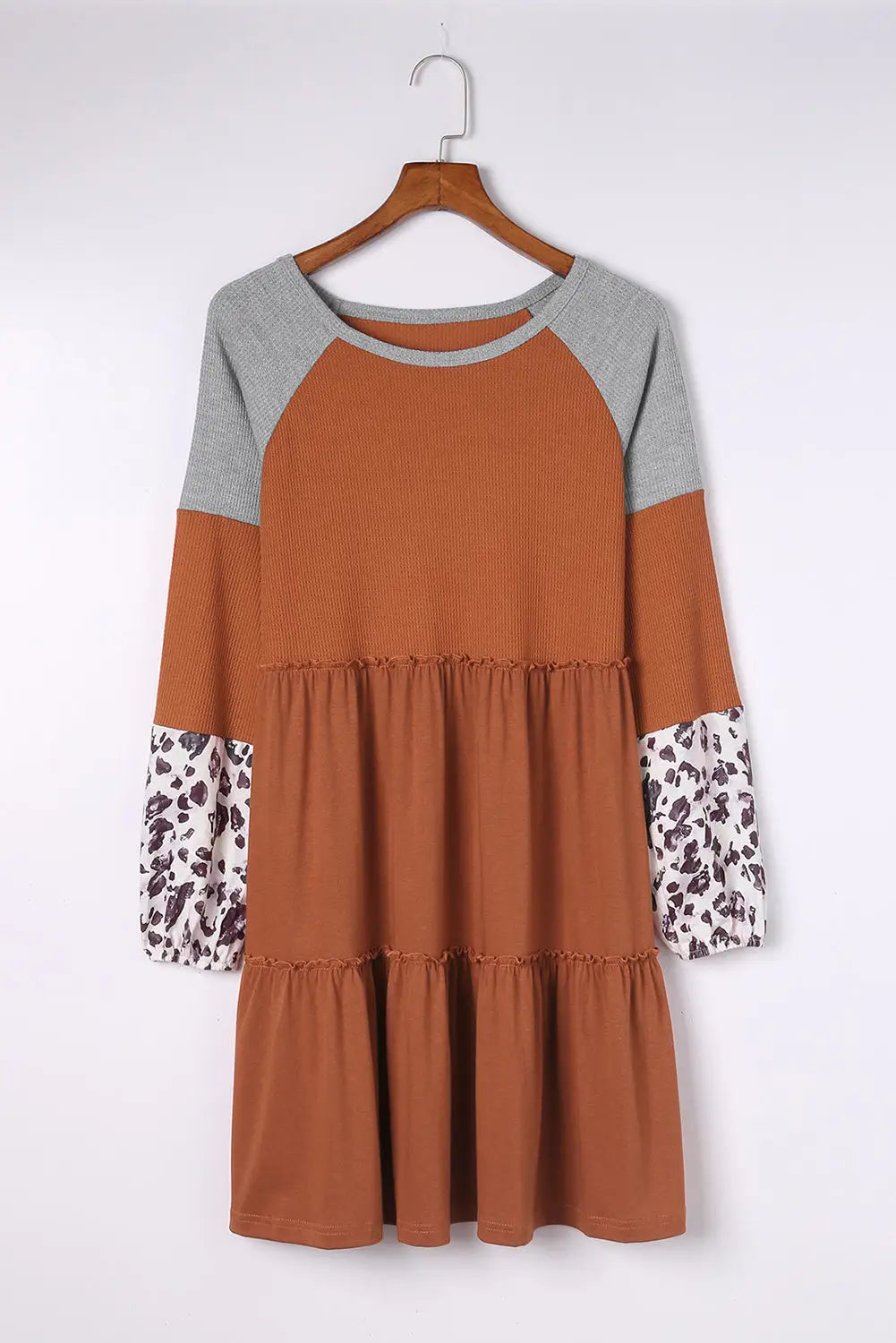 Brown Waffle Knit Leopard Patchwork Long Sleeve Dress