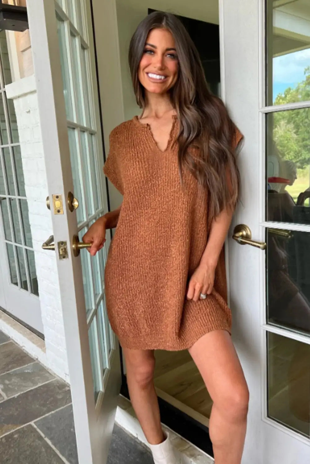 Camel Short Sleeve Notched V Neck Sweater Dress
