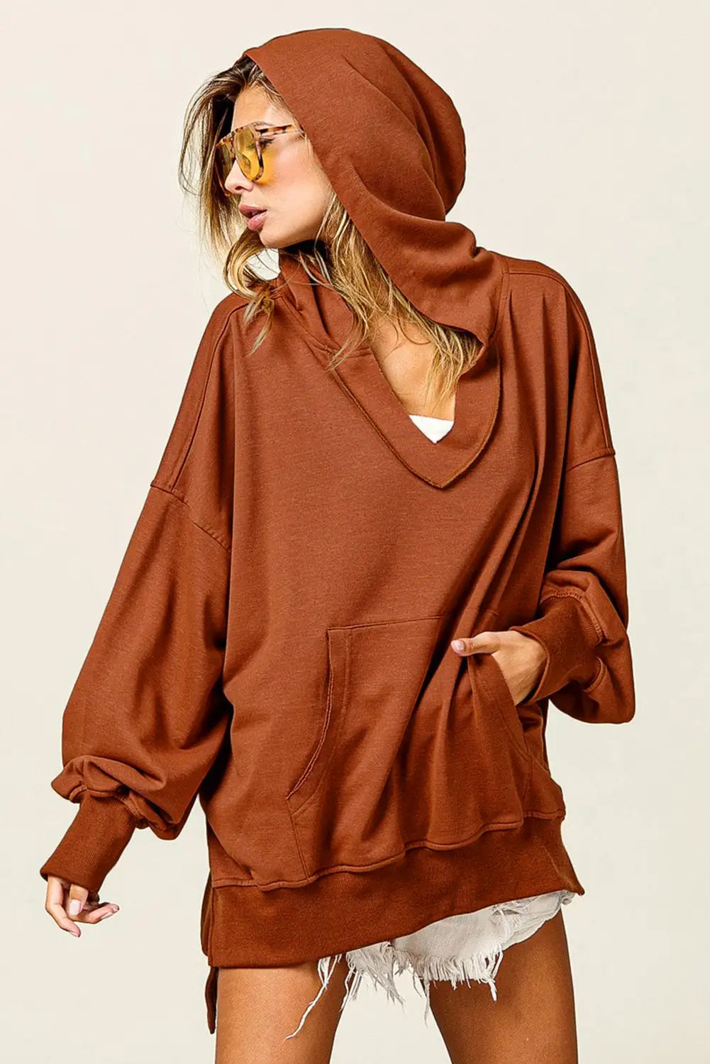 Chestnut V Neck Kangaroo Pocket Oversized Hoodie