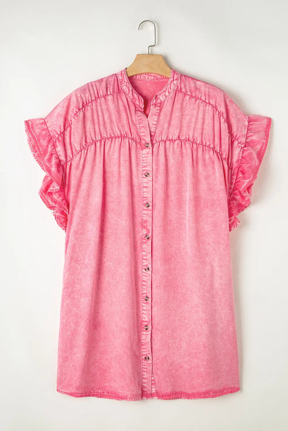 This mineral wash dress features a v neck, buttons front, ruffled short sleeves