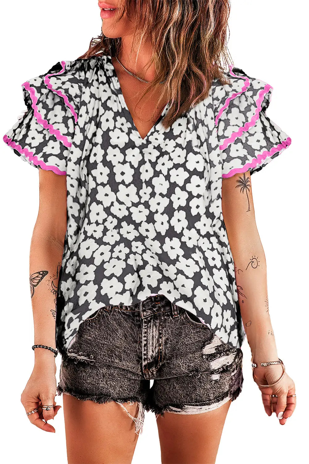 Floral print v-neck short sleeve top featuring tiered ruffle detail at sleeve