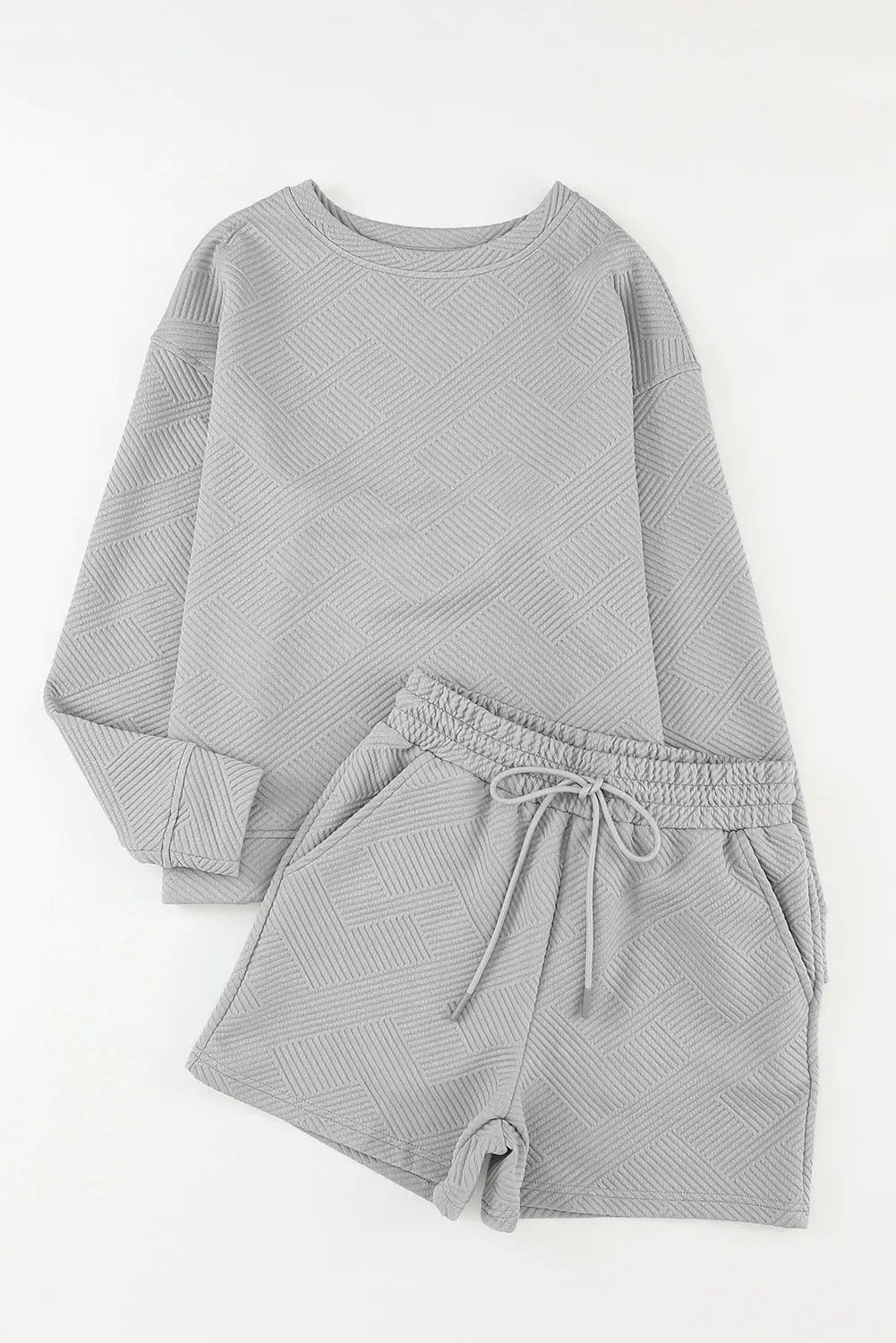 Gray Textured Long Sleeve Top and Drawstring Shorts Set-2 Gray Textured Long Sleeve Top and Drawstring Shorts Set-2