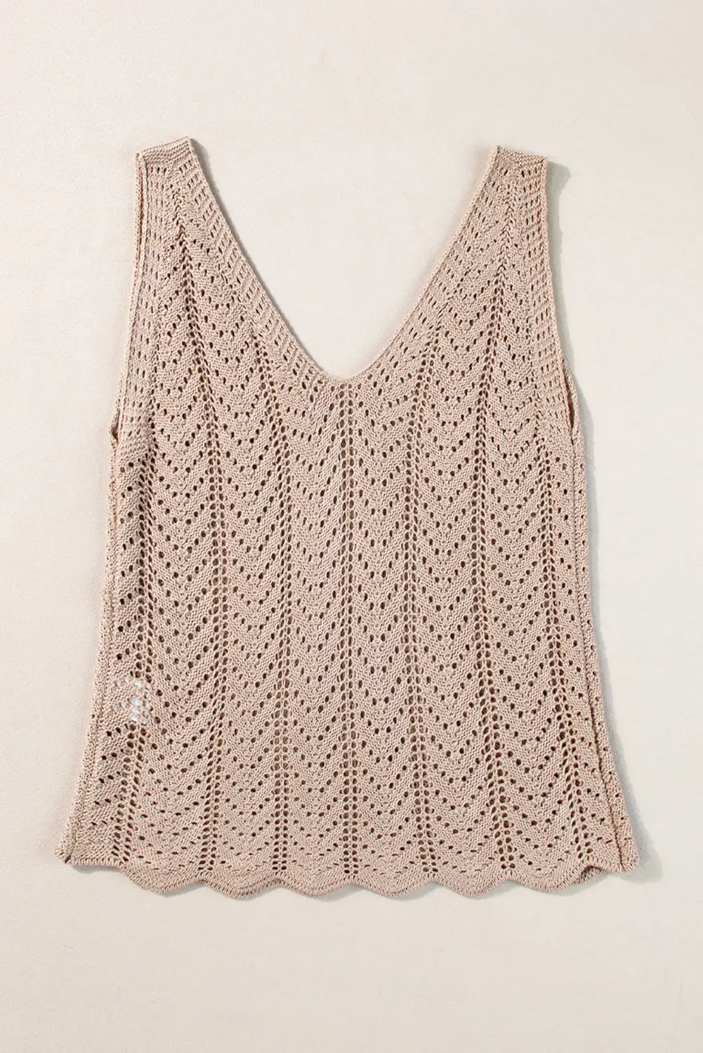 Exude boho-chic vibes with this Scalloped Hem V Neck Crochet Knit Vest