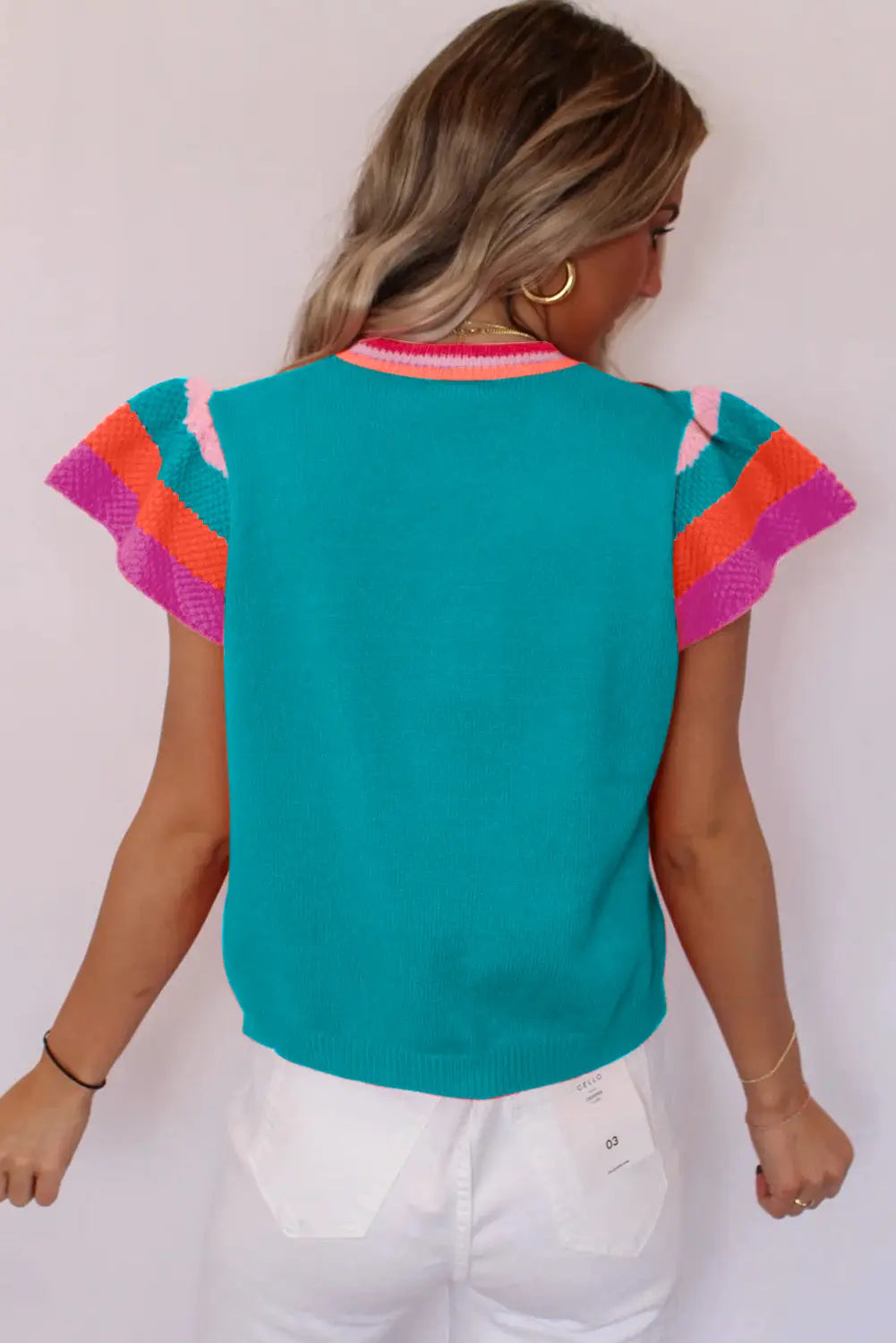 KnitT-Shirt - Turquoise Contrast Flutter Sleeves Sweater