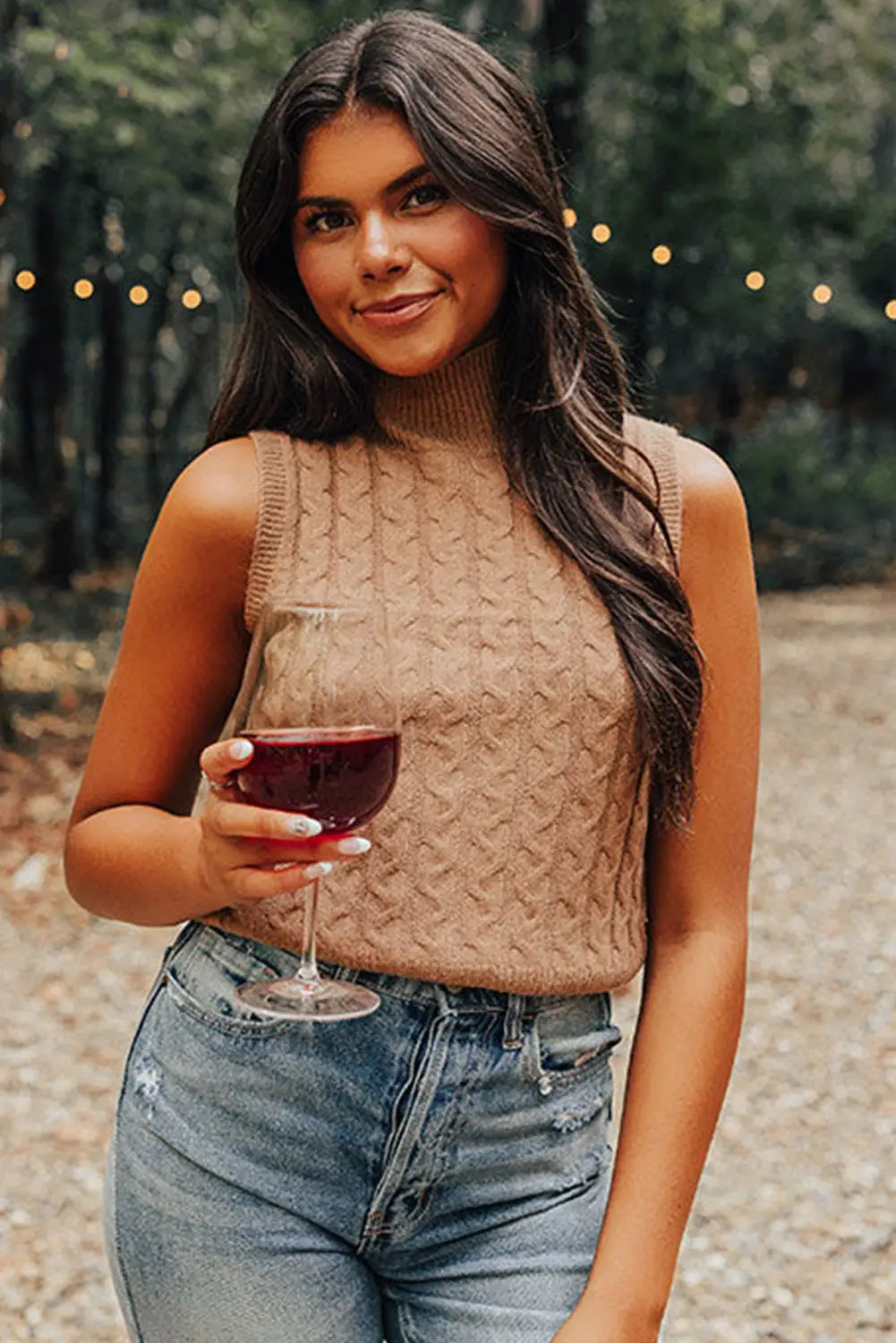 Light Tank Top - French Beige Solid Color Cable Knit High Neck