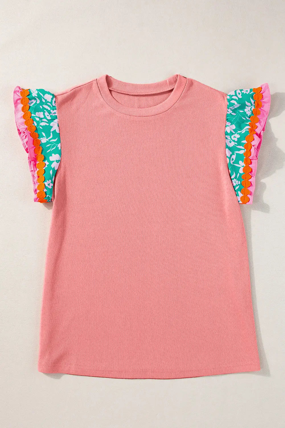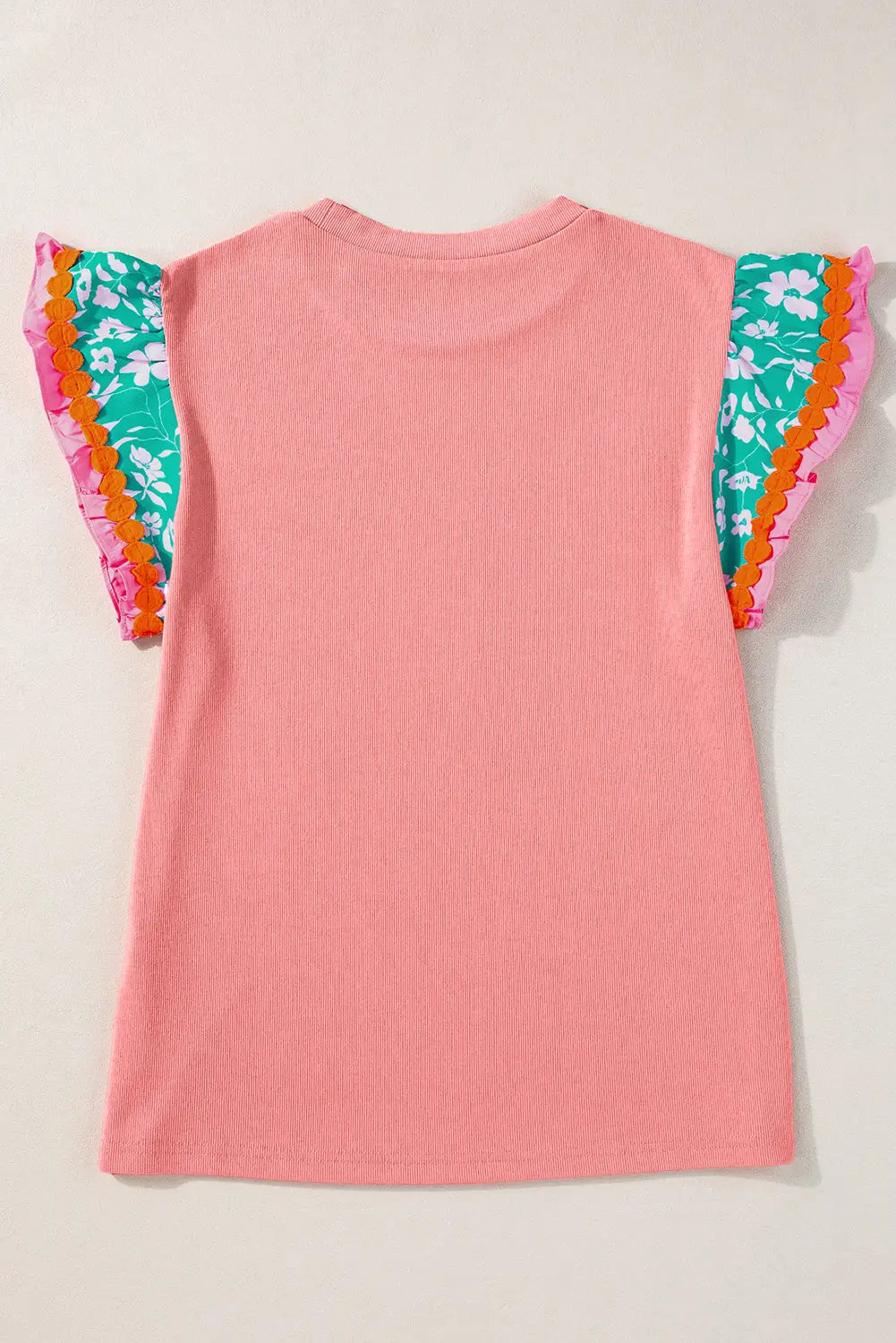 Peach Blossom Contrast Ricrac Floral Sleeve Top-0 Peach Blossom Contrast Ricrac Floral Sleeve Top-0