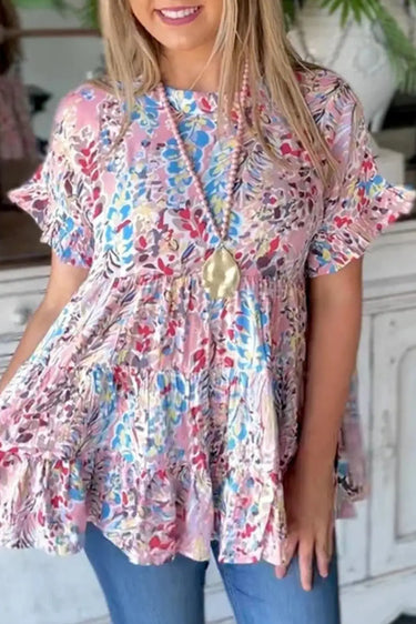Pink Floral Print Ruffle Sleeve Babydoll Top