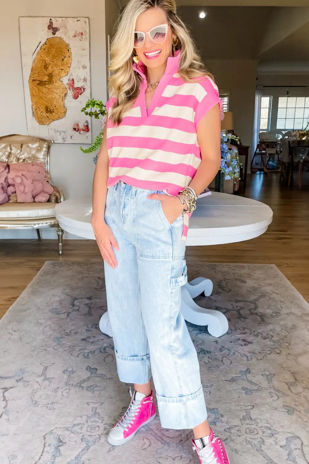 Pink Stripe Top - V Neck Collared Cap Sleeve-2 Pink Stripe Top - V Neck Collared Cap Sleeve-2