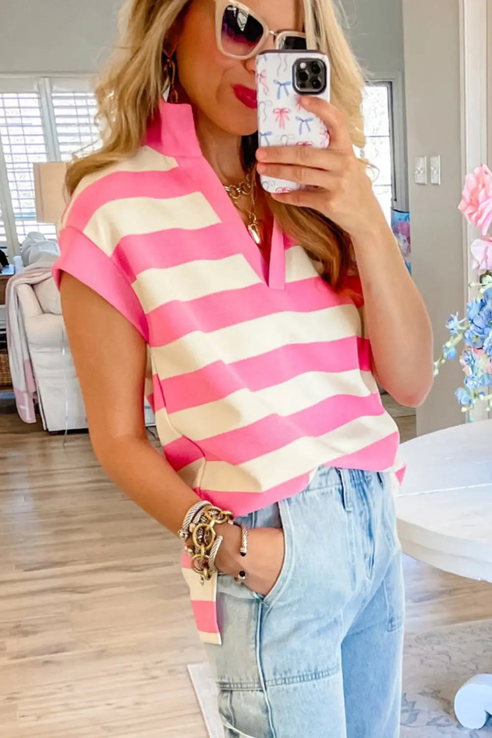 Pink Stripe Top - V Neck Collared Cap Sleeve-1 Pink Stripe Top - V Neck Collared Cap Sleeve-1