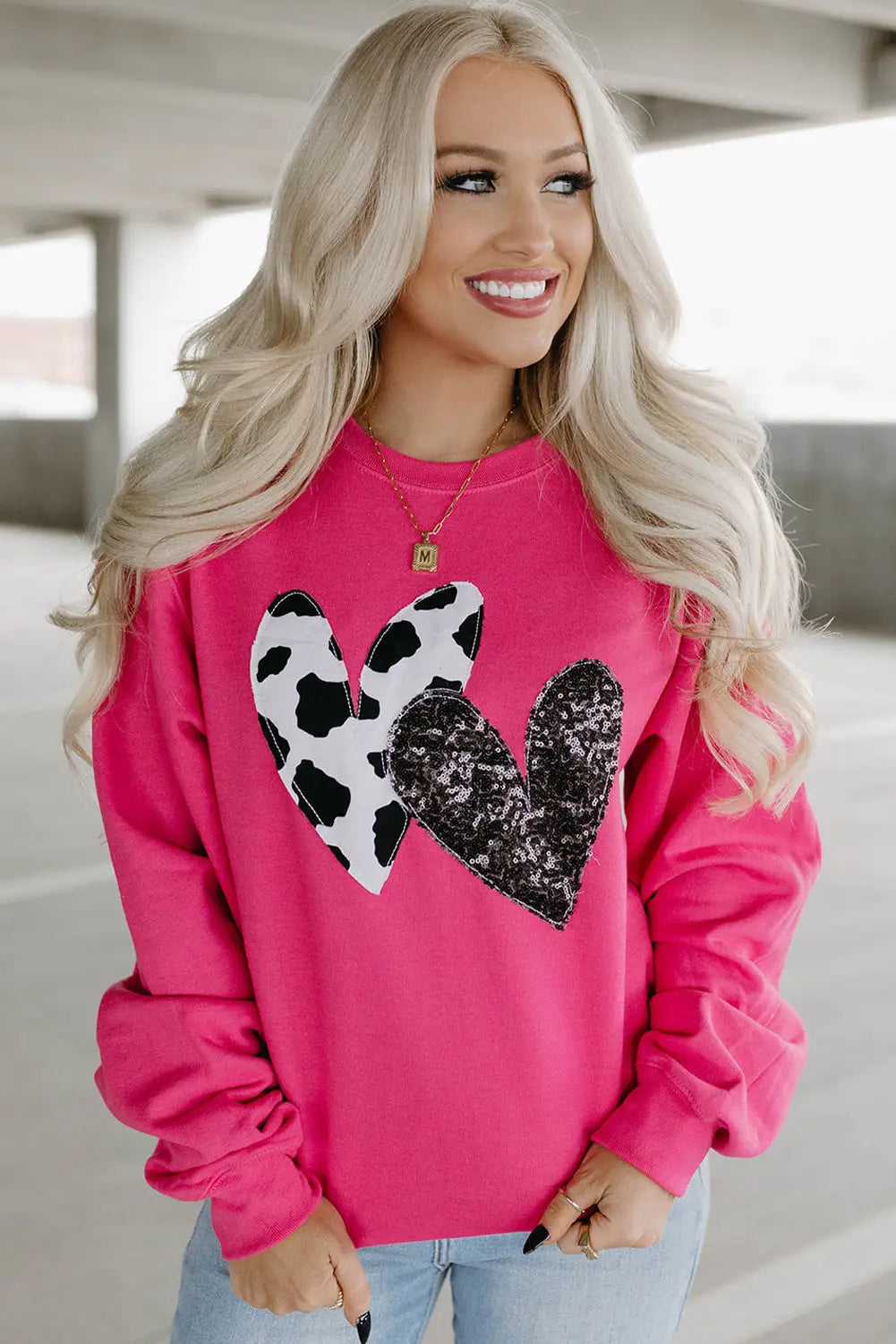 Strawberry Pink Cow & Sequin Double Heart Patch Graphic Sweatshirt