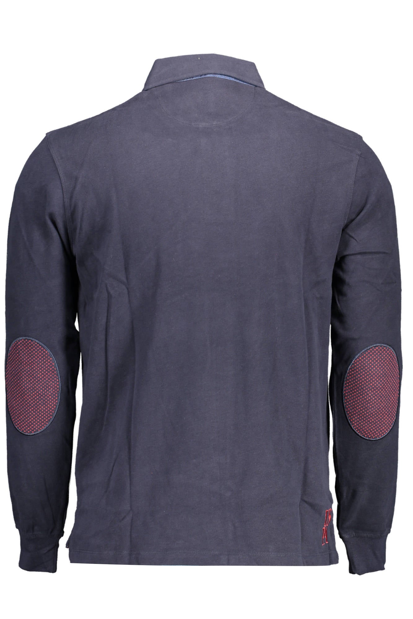 long-sleeved polo shirt, 3 buttons, embroidery, applications on the elbows, contrasting details, logo