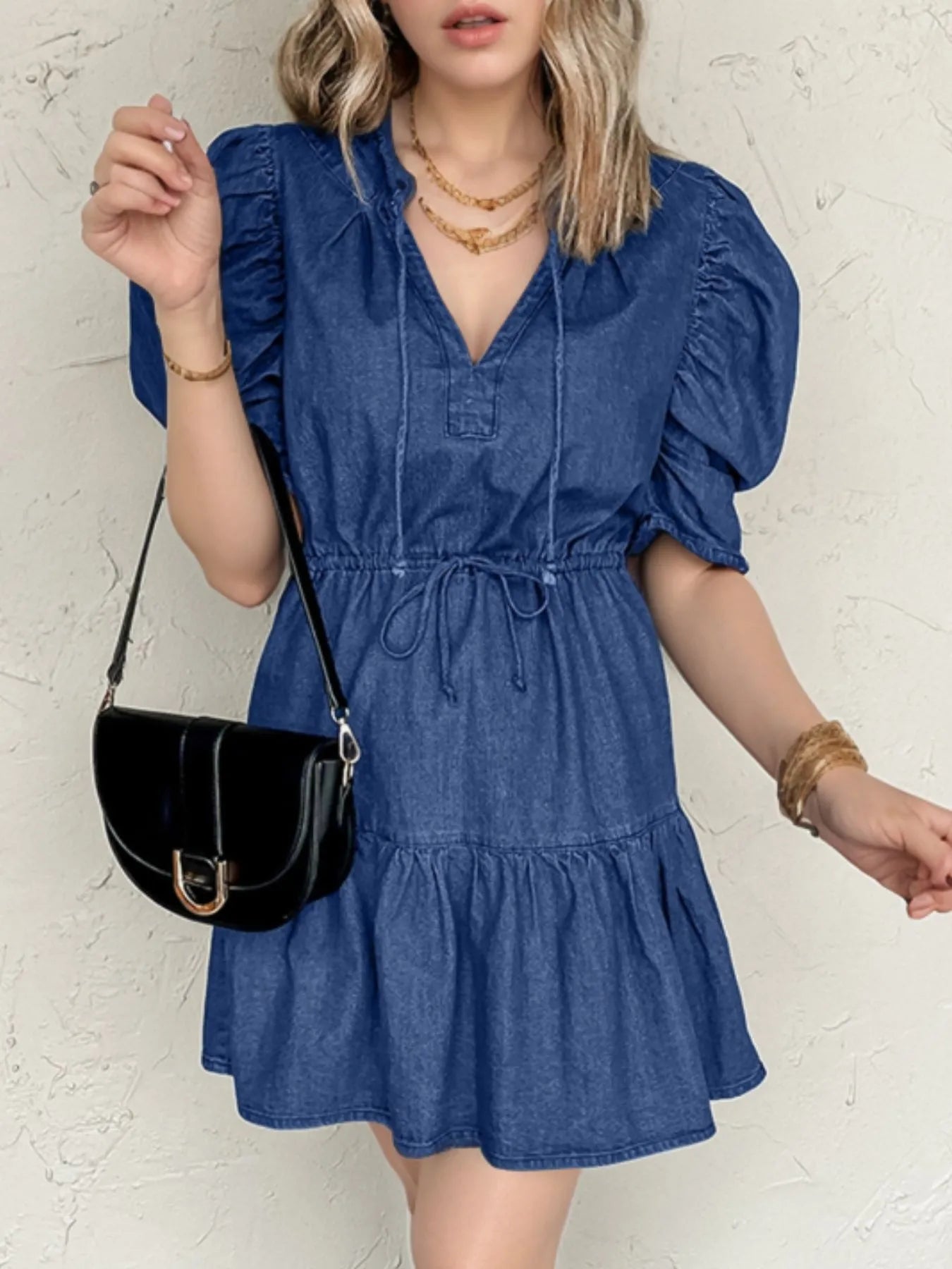 Drawstring High Waist Puff Sleeve Denim Mini Dress