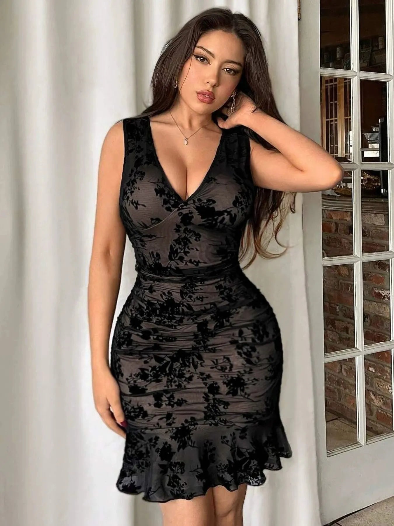 Lace V-Neck Sleeveless Bodycon Ruffle Hem Dress