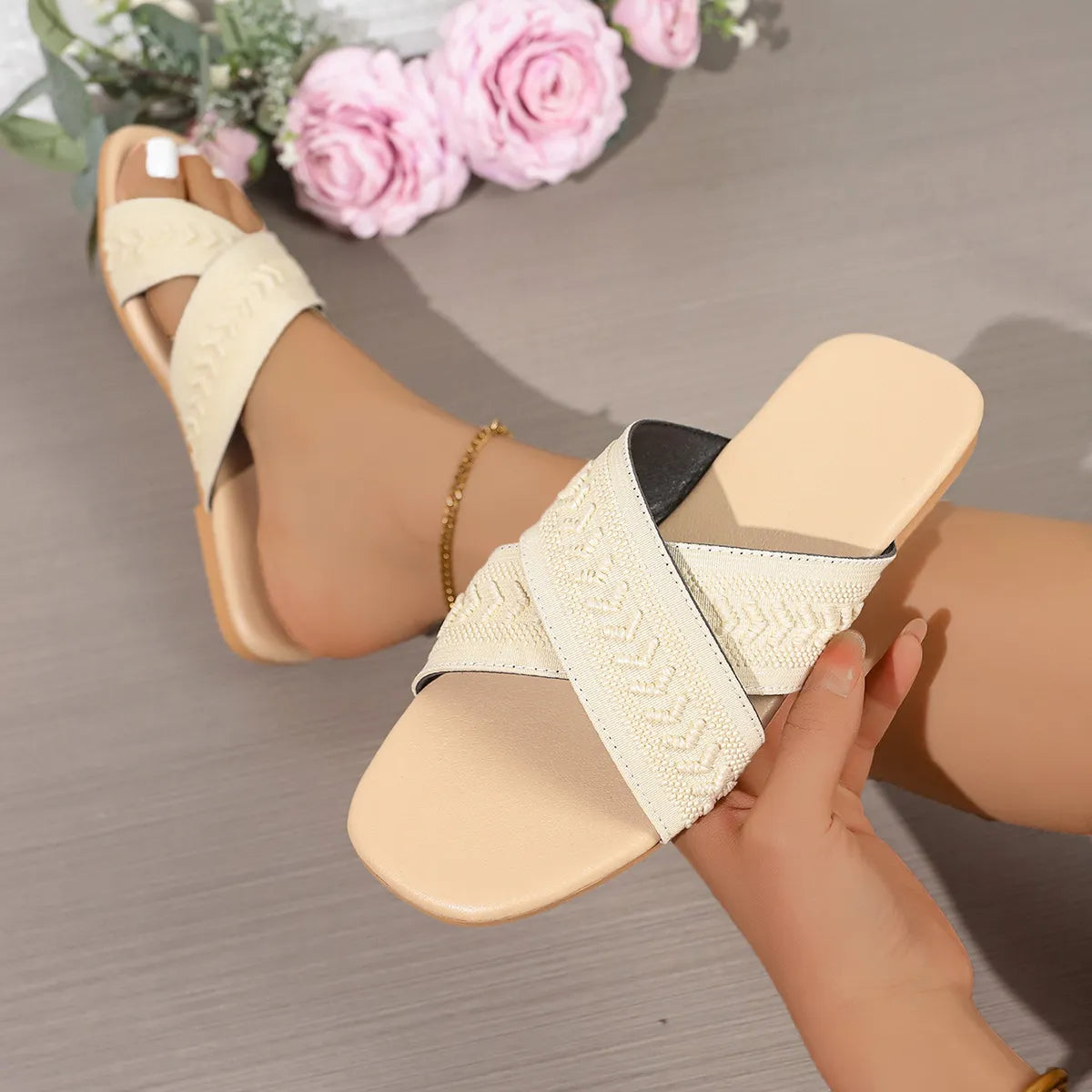 These fashion flat sandals feature an elegant criss-cross woven strap design perfect for casual summer wear. The black woven textile upper provides both style and breathability, while the flat sole ensures all-day comfort. The slip-on design makes them easy to wear, and the neutral color palette makes them versatile for matching with various outfits. The textured footbed provides grip and comfort, while the open-toe design keeps feet cool in warm weather. Ideal for beach trips, casual outings, or everyday wear.