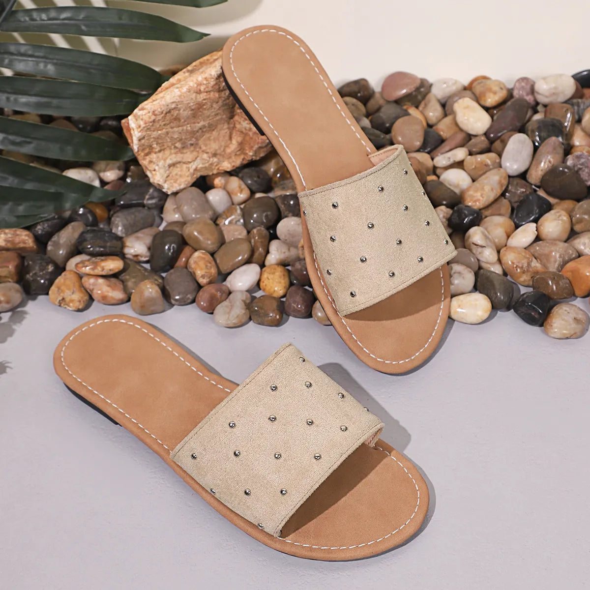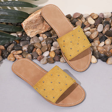 These fashionable slide sandals feature a charming polka dot pattern on a mustard yellow upper. Made with quality materials including a comfortable faux leather footbed and durable synthetic sole. The simple slip-on design makes them perfect for casual everyday wear. The flat heel and open toe style provide comfort while maintaining a stylish look. Ideal for summer outfits, these sandals combine fashion design elements with practical functionality. The neutral tan insole complements the eye-catching yellow upper, creating a versatile accessory that pairs well with multiple outfits.