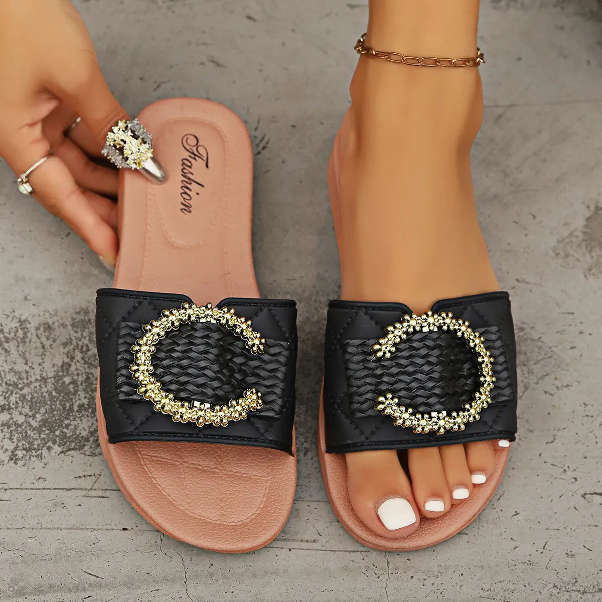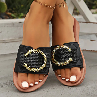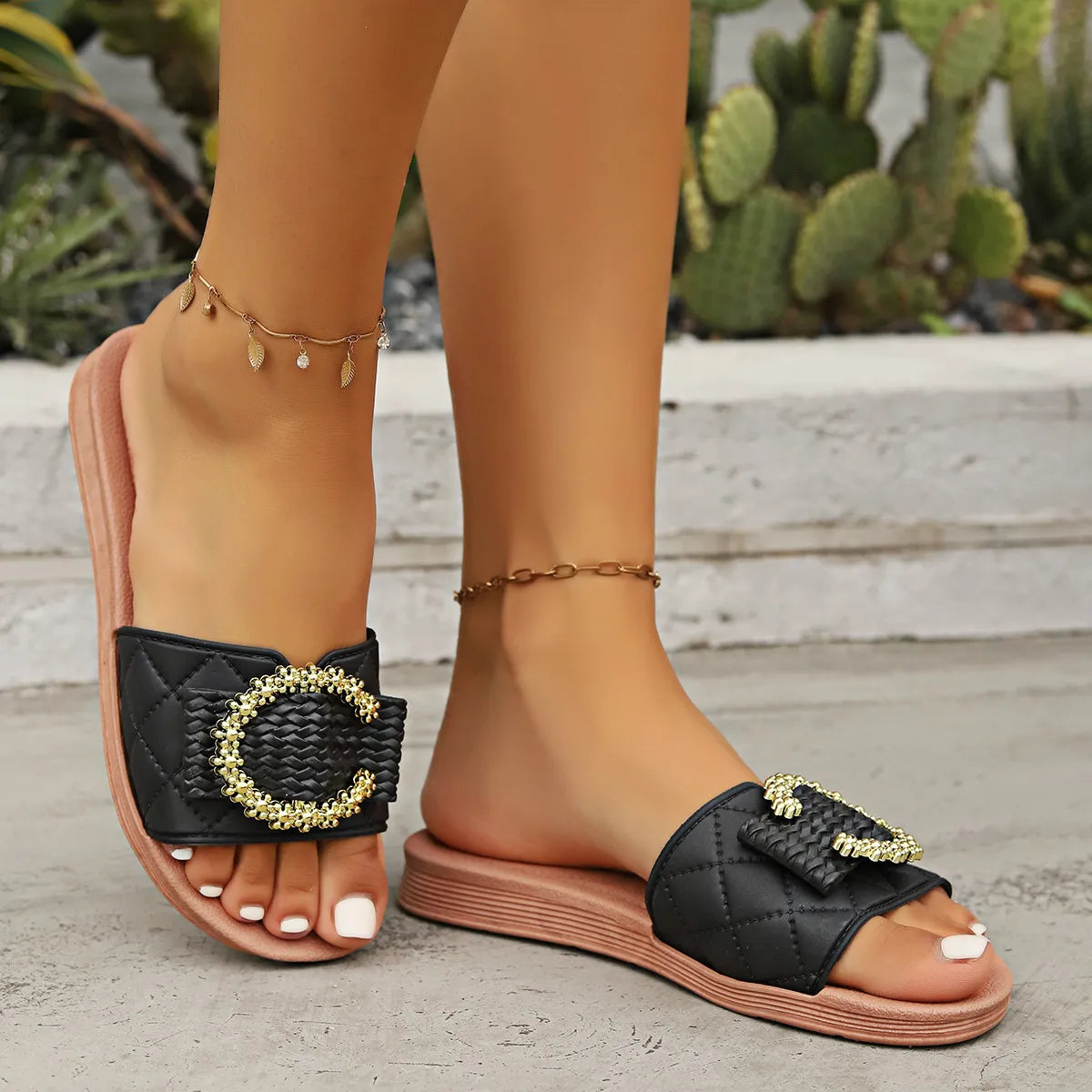 These sophisticated flat sandals feature a stunning crystal-embellished buckle design set against a quilted black base. The sandals are crafted from high-quality PU leather with a comfortable cushioned footbed for all-day wear. The slip-on style combines practicality with elegance, while the flat sole ensures maximum comfort. The gold-tone crystal embellishments create a luxurious look that can be dressed up or down. Perfect for summer occasions, these sandals offer both style and comfort with their durable construction and classic design.
