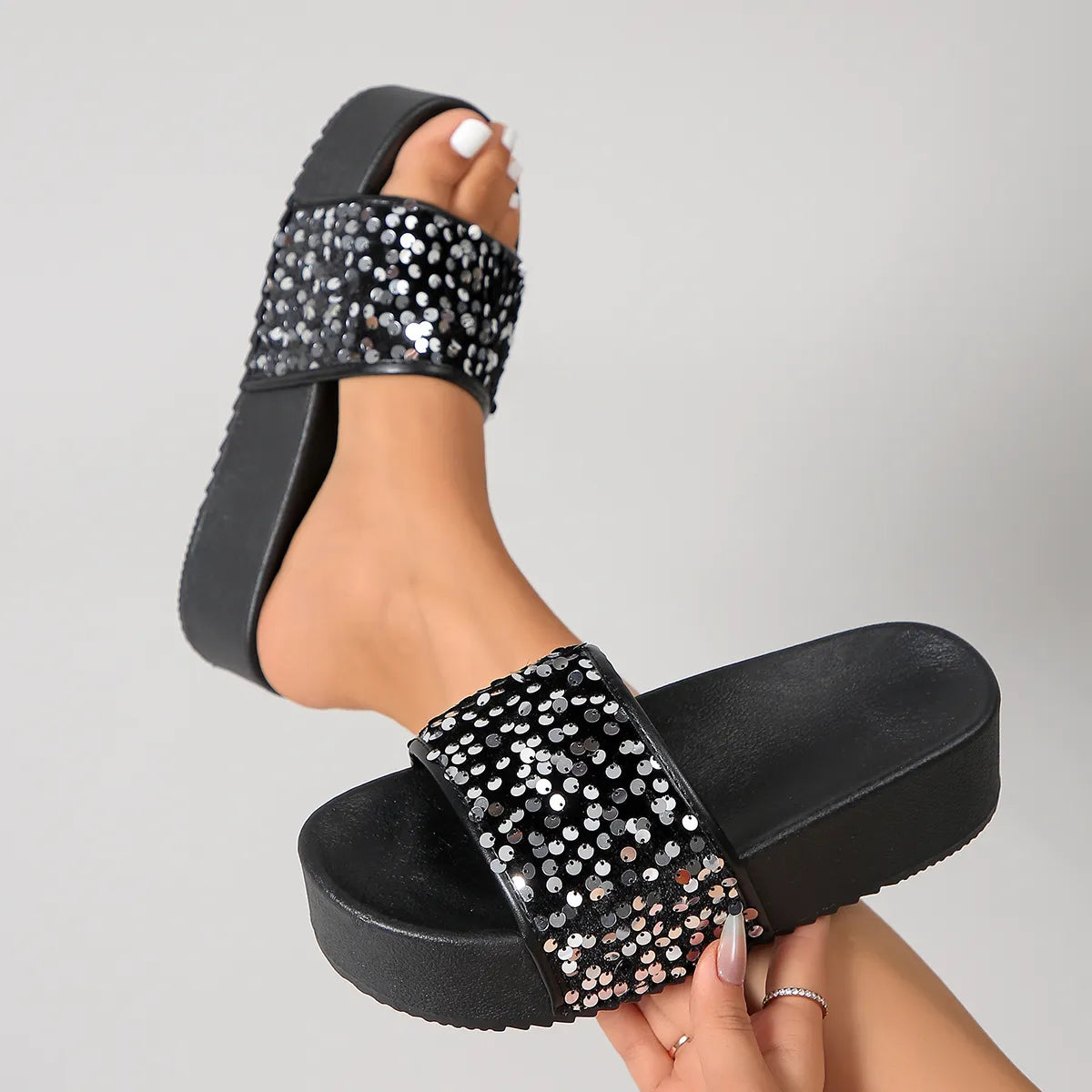These stunning platform slide sandals feature a glamorous sequin-embellished upper band that catches the light beautifully. The black platform sole provides comfortable height and support, while the slip-on design ensures easy wearing. Made with quality materials including a cushioned footbed and durable rubber outsole, these sandals combine style with comfort. The rose gold and black sequin pattern creates an eye-catching effect perfect for both casual and dressy occasions. Ideal for summer wear and can be paired with various outfits from casual to semi-formal.