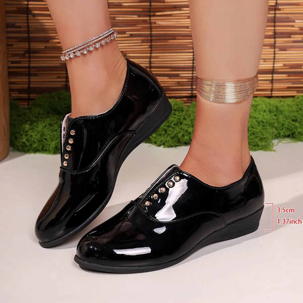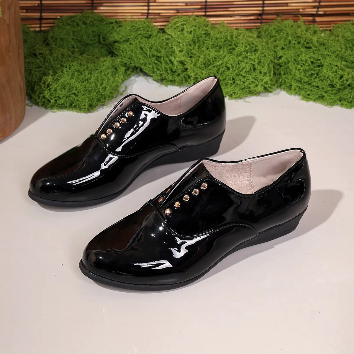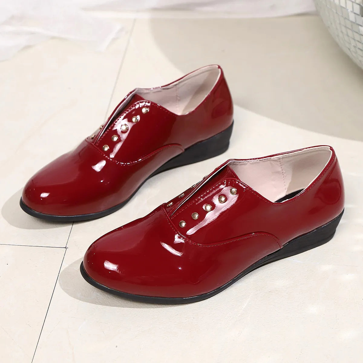 These sophisticated slip-on loafers feature a luxurious patent leather construction in an elegant wine red shade. The shoes showcase a streamlined silhouette with decorative button accents along the vamp. Perfect for both casual and semi-formal occasions, these loafers offer comfort with their flat heel and rounded toe design. The glossy finish adds a touch of glamour while maintaining professional appeal. Made with quality materials, they provide durability and style for everyday wear.