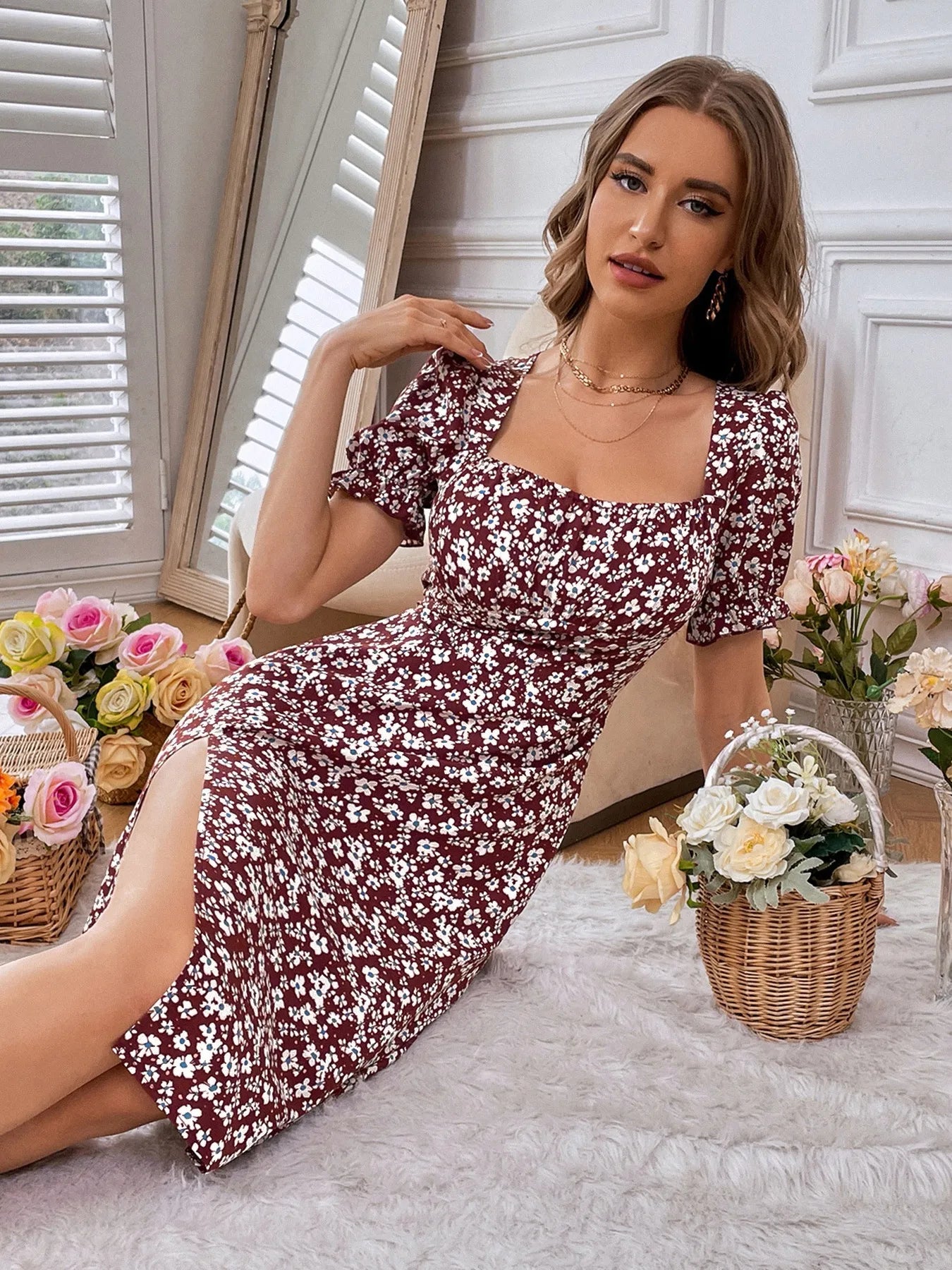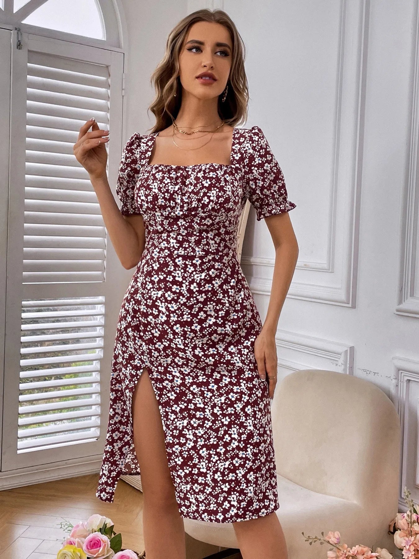 Printed Square Neck Split Hem Dress