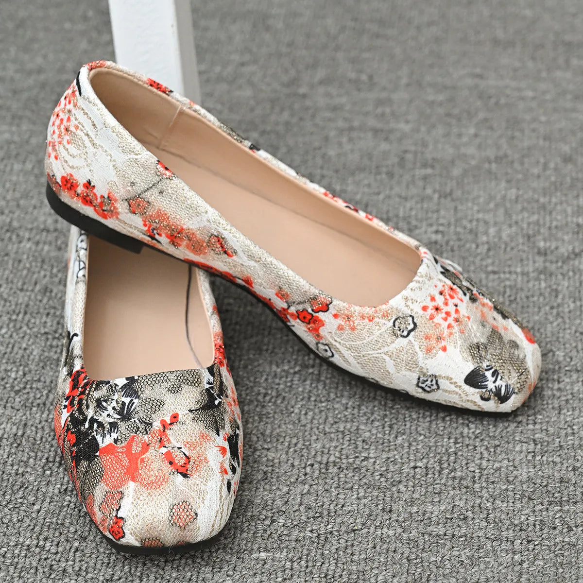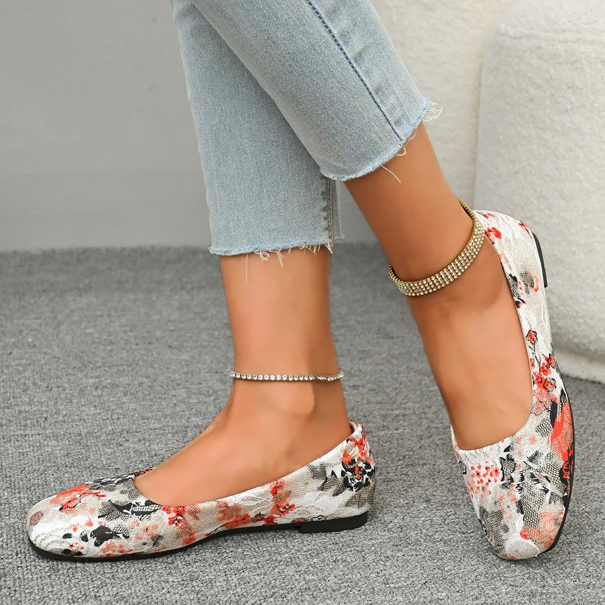 These charming slip-on loafers feature a beautiful floral print pattern in coral and grey tones against a light background. The shoes are designed for both style and comfort, with a flat sole and easy slip-on construction. Made with quality materials, these loafers offer breathability and flexibility for all-day wear. The classic silhouette is updated with a modern floral pattern, making them perfect for casual outfits and daily activities. The rounded toe design provides ample room for comfort, while the structured build ensures durability and shape retention.