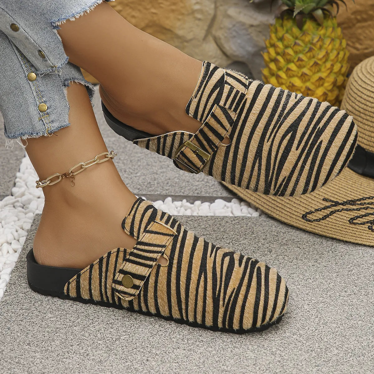 These stylish canvas mules feature a chic black and tan striped pattern that adds visual interest to any outfit. The slip-on design with an open back provides effortless wearability, while the decorative metal buckle detail adds a touch of sophistication. Crafted from soft, breathable canvas material, these loafers offer both comfort and style. The cushioned insole and low heel ensure all-day comfort, making them perfect for both work and weekend wear. The versatile design pairs beautifully with everything from jeans to dresses, making them a wardrobe essential.