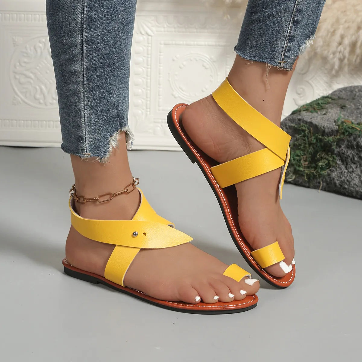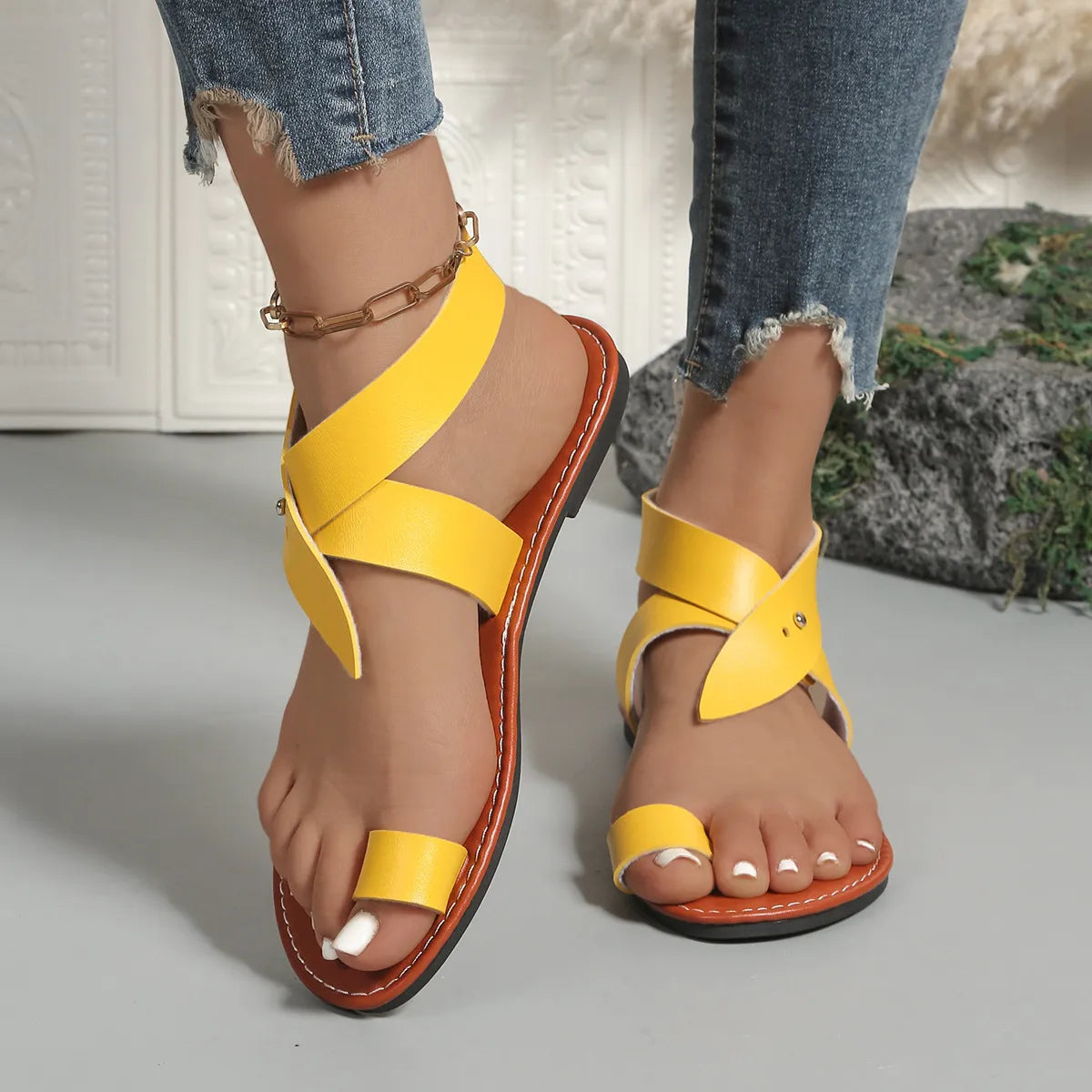 These fashionable sandals feature a striking metallic gold finish with an elegant cross-strap design. The toe ring detail adds a bohemian touch while the flat sole ensures all-day comfort. Made with quality materials, these sandals combine style with practicality. The cross-straps provide secure fitting while the metallic finish makes them perfect for both casual and dressy summer occasions. The design includes a decorative ankle chain detail that elevates the overall look. These sandals are ideal for beach outings, summer parties, or everyday wear.