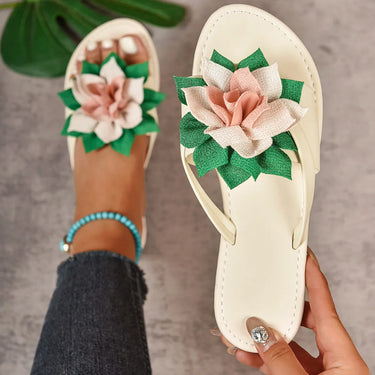 These charming sandals feature a beautiful 3D floral decoration combining pink and green hues on a cream-colored base. The sandals are crafted with a comfortable flat sole and thong-style design, perfect for casual summer wear. The detailed flower embellishment adds an elegant touch while maintaining practicality. Made with durable materials suitable for everyday wear, these sandals blend style with comfort. The decorative flower accent makes these sandals stand out while remaining versatile enough to match various outfits. Ideal for beach outings, casual walks, or any summer activity requiring both style and comfort.