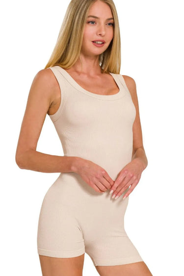 This premium seamless ribbed bodysuit combines comfort with shapewear functionality. Crafted from a soft, stretchy ribbed fabric blend, it features a flattering scoop neckline tank design with integrated shorts that extend to mid-thigh. The seamless construction ensures no visible lines under clothing while providing gentle compression for a smooth, sculpted silhouette. The breathable material offers all-day comfort, making it perfect for everyday wear, special occasions, or as a layering piece. The nude tone blends seamlessly with various skin tones for invisible support.