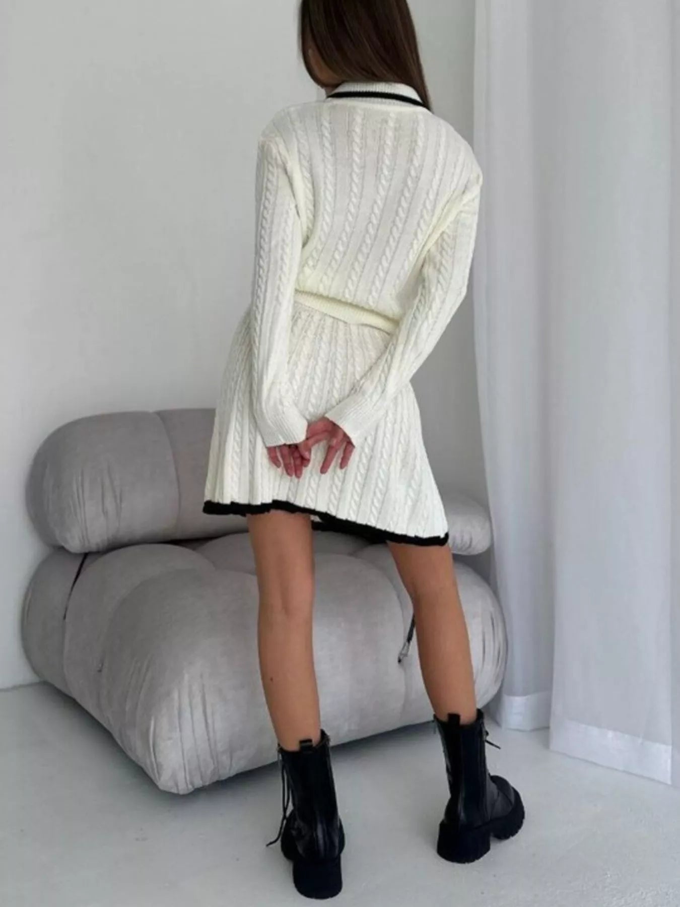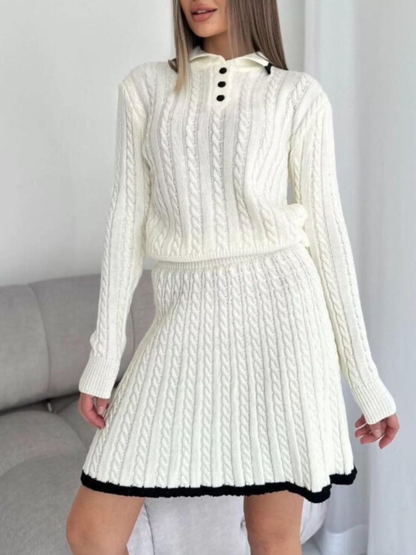 Cable Knit Long Sleeve Top and Skirt Sweater Set