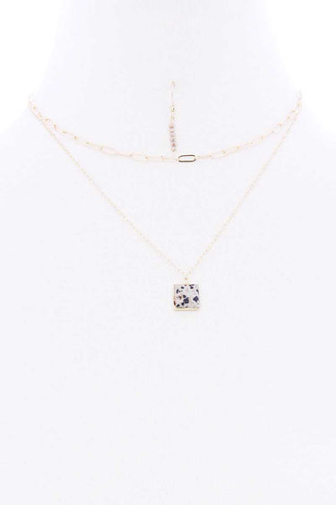2 Layered Chain Metal Square Marbling Stone Pendant Necklace