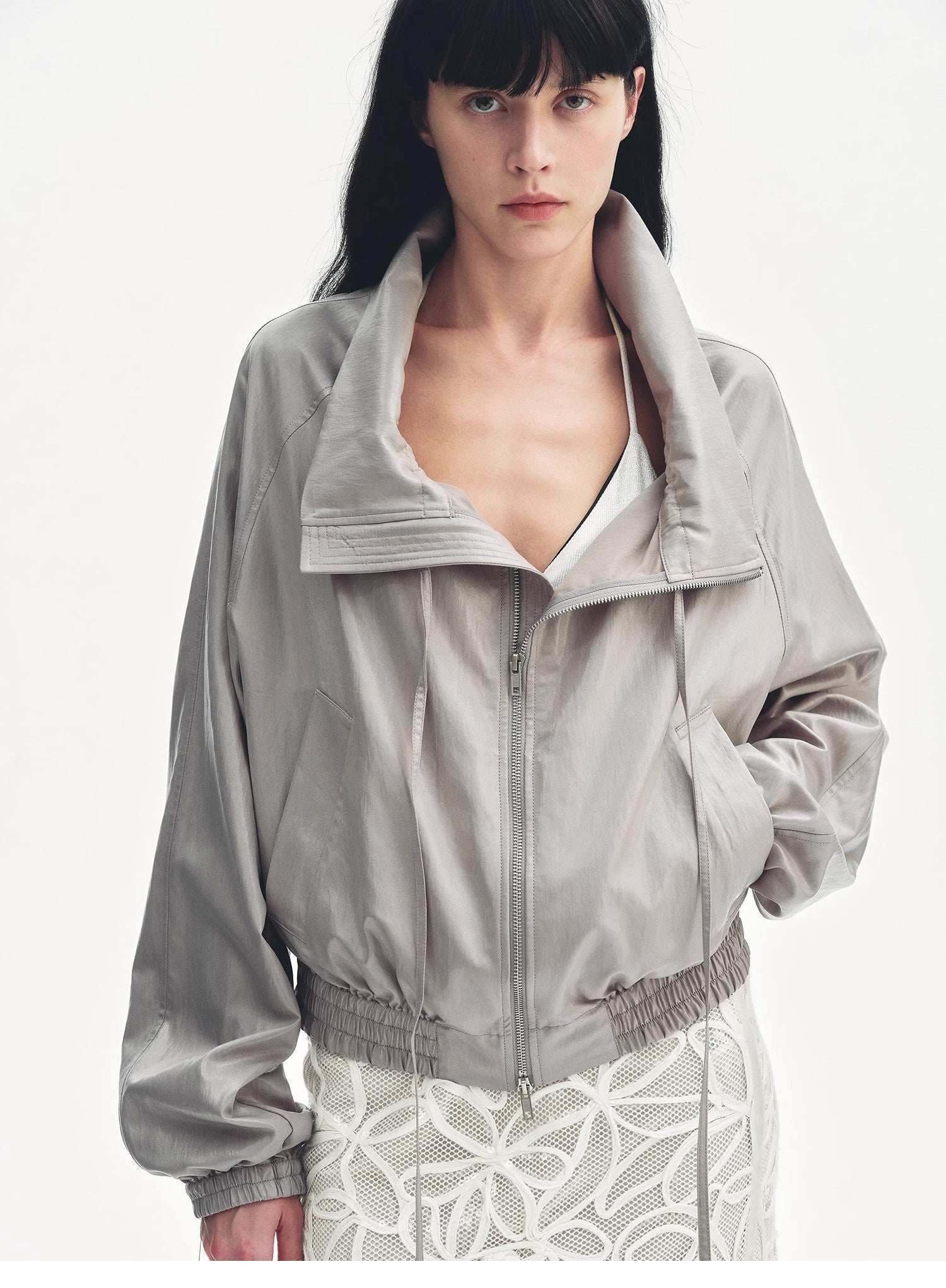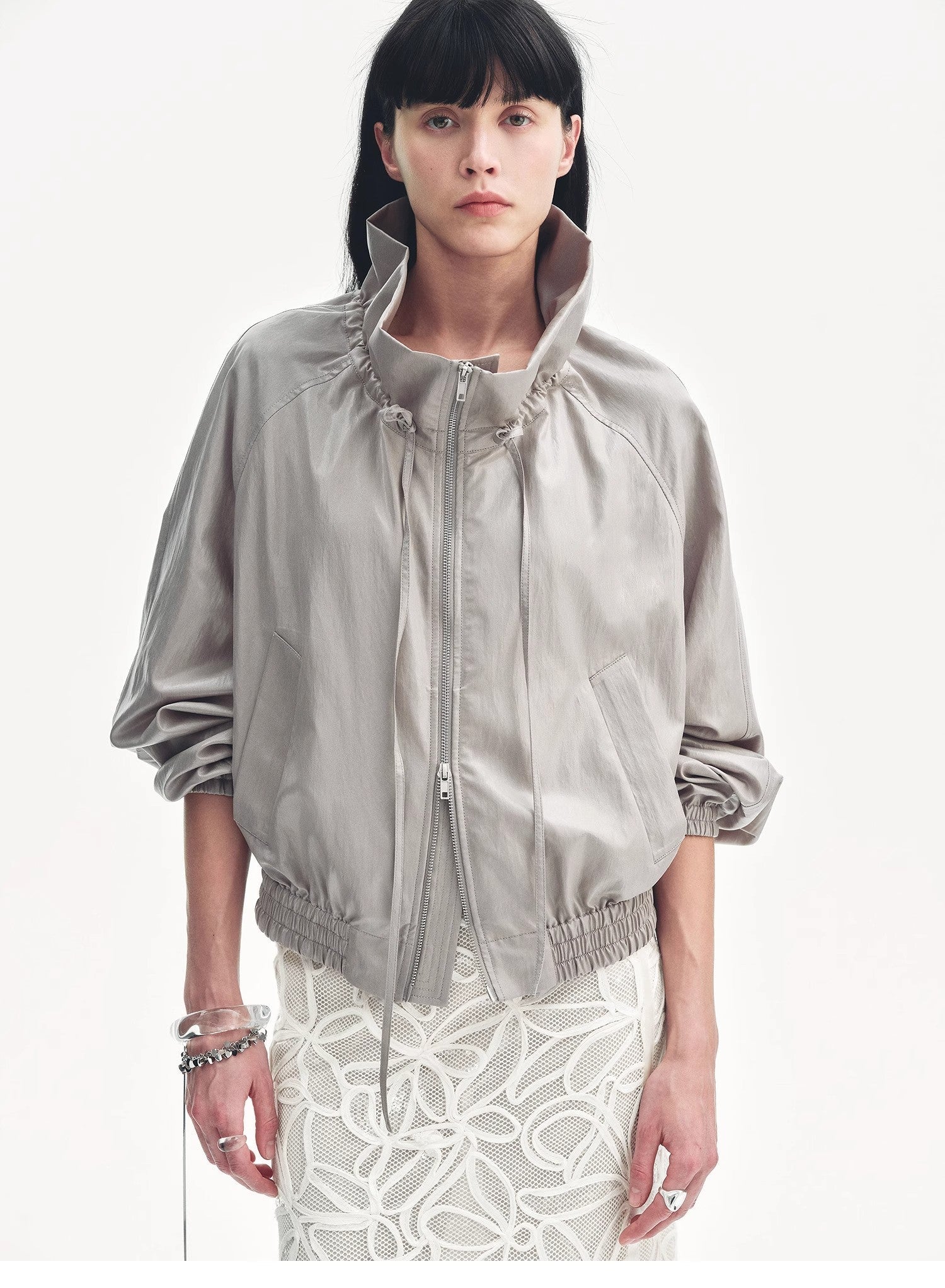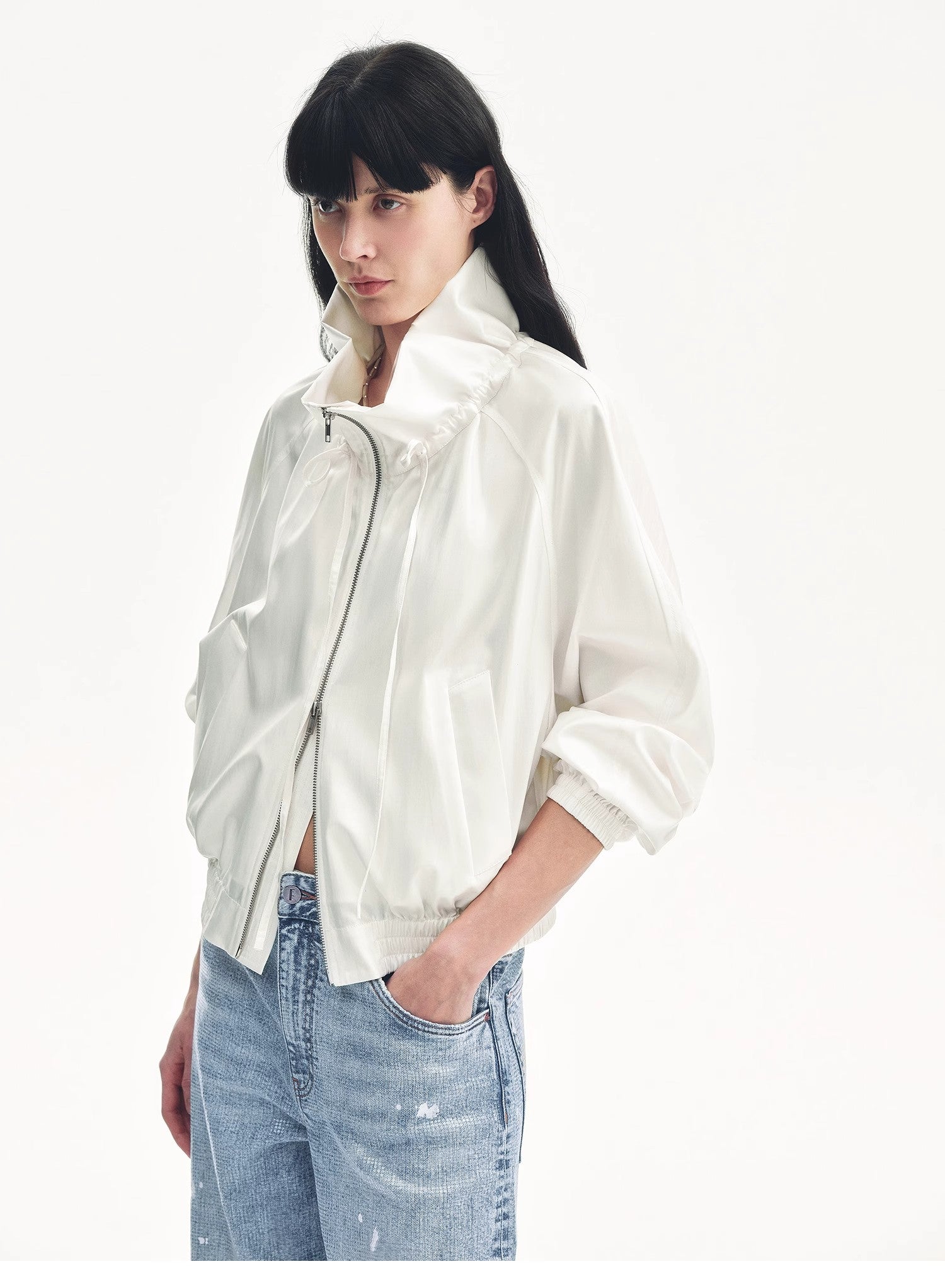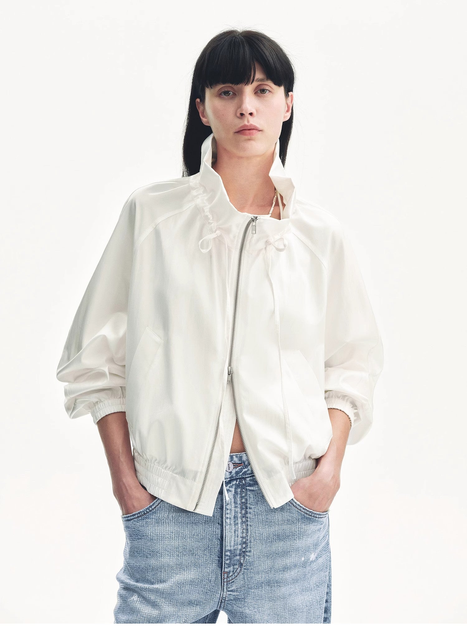 The delicate drawstring ruffled stand collar protects the neck from sunburn, offering foldable and adjustable styling for versatile looks. Simple drop shoulder sleeves with a straight fit provide clean lines and ample shoulder/back room for a relaxed, elongated silhouette. Elastic hem with double-zip closures allows easy wear and fit adjustment, exuding laid-back charm.