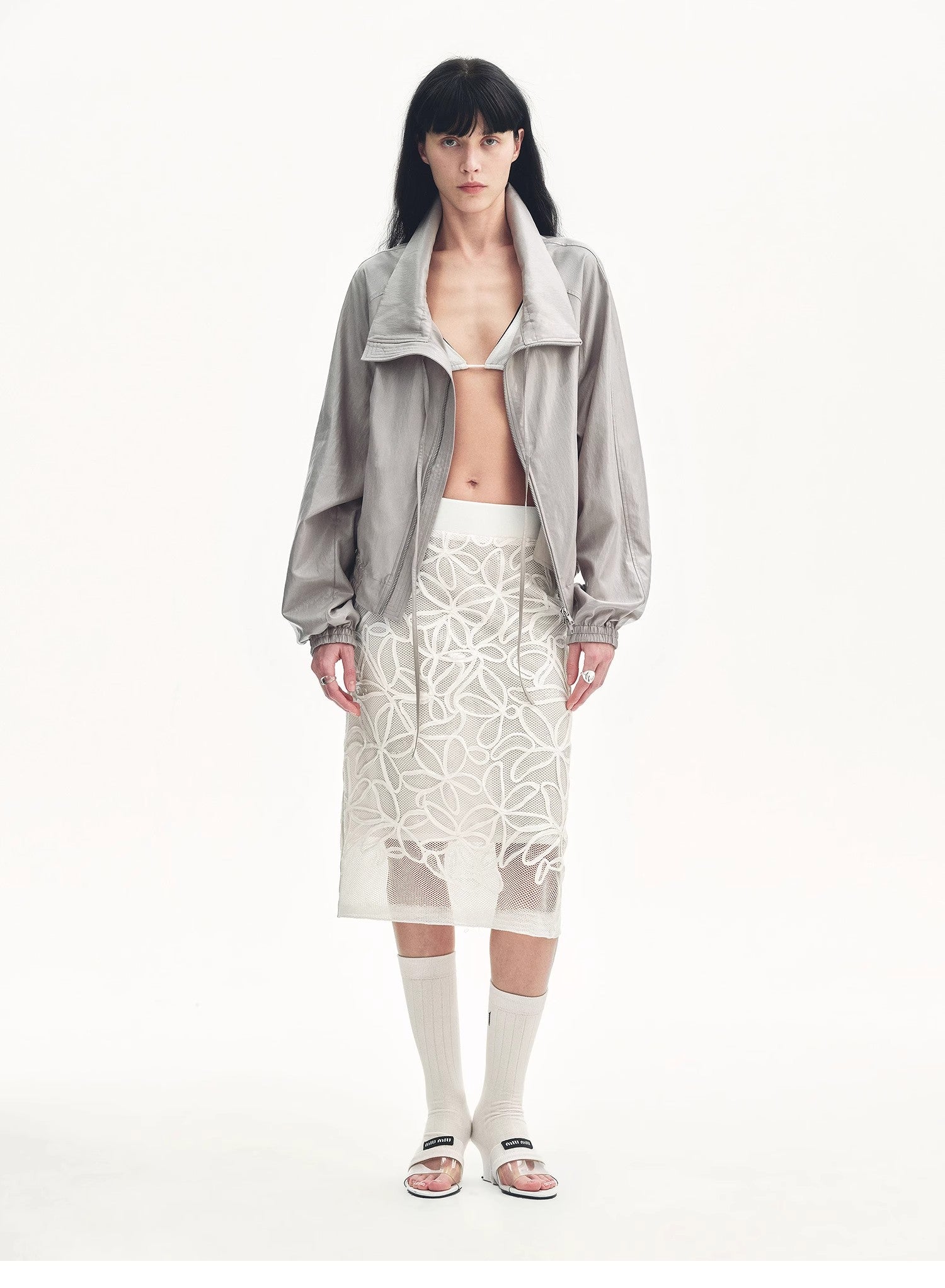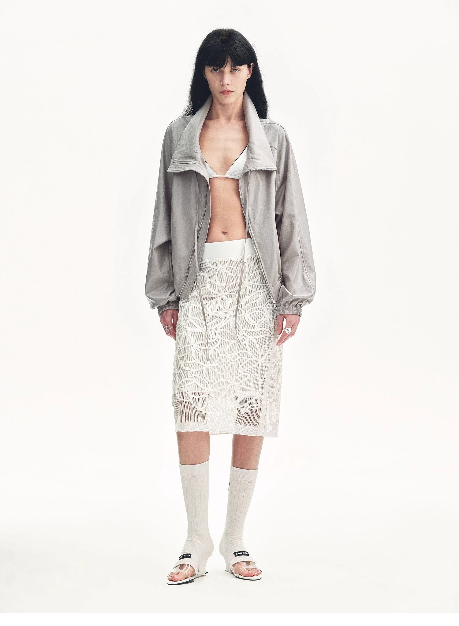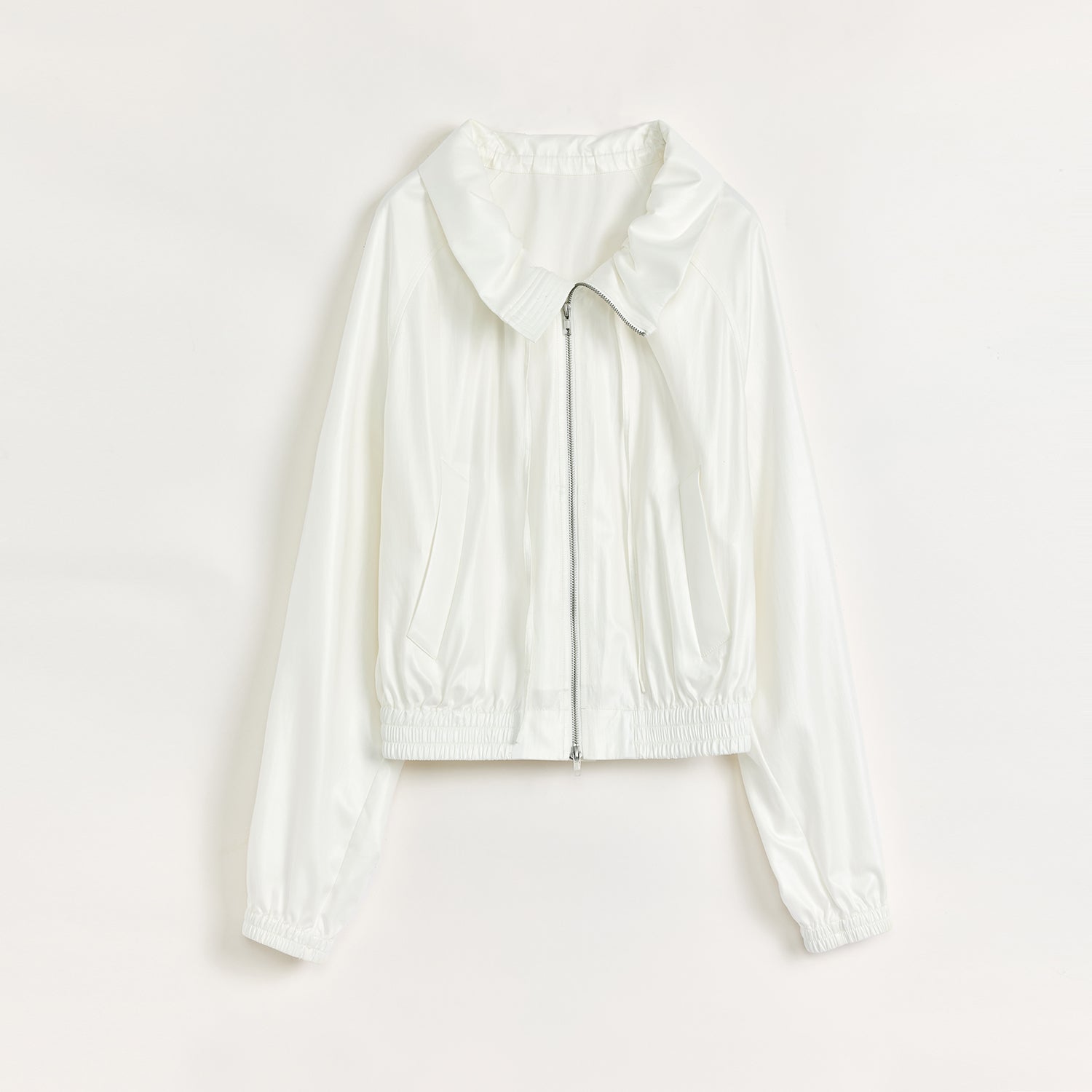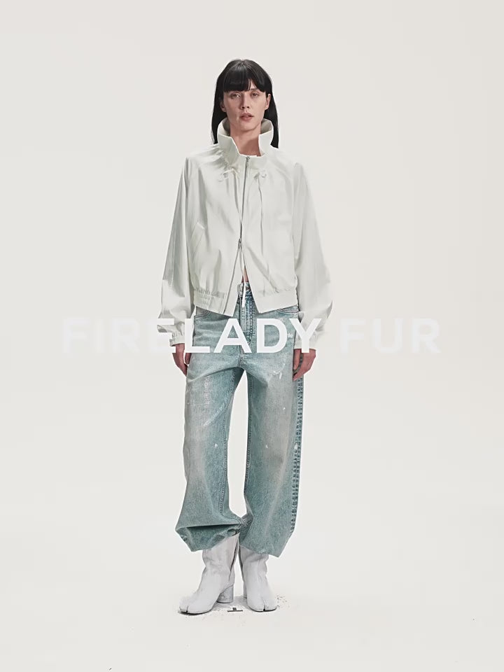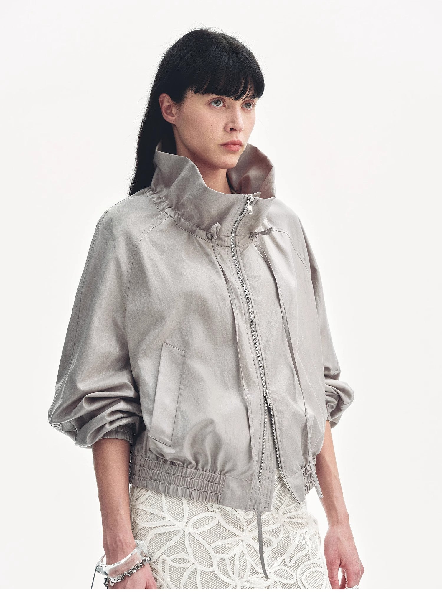The delicate drawstring ruffled stand collar protects the neck from sunburn, offering foldable and adjustable styling for versatile looks. Simple drop shoulder sleeves with a straight fit provide clean lines and ample shoulder/back room for a relaxed, elongated silhouette. Elastic hem with double-zip closures allows easy wear and fit adjustment, exuding laid-back charm.
