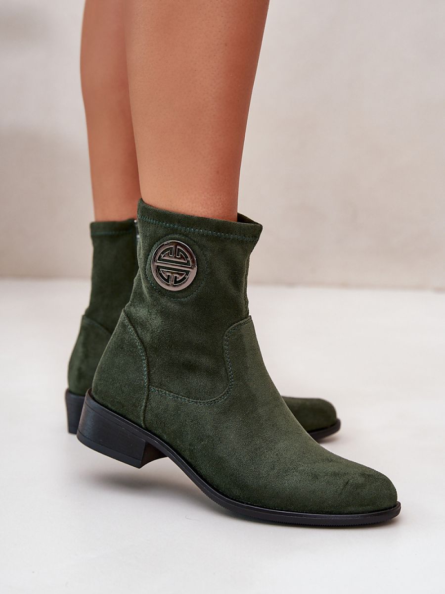 Women's ankle boots with a low heel from the brand Jezzi are an elegant and functional choice for any occasion. They are fastened with a zipper, ensuring comfortable putting on and taking off, which is particularly useful in everyday use. The almond-shaped toes add subtle elegance and slim down the foot. There is a decorative detail on the upper that adds a stylish character and uniqueness to them. The interior is only insulated at the height of the foot. This model blends perfectly with both casual and more formal outfits.