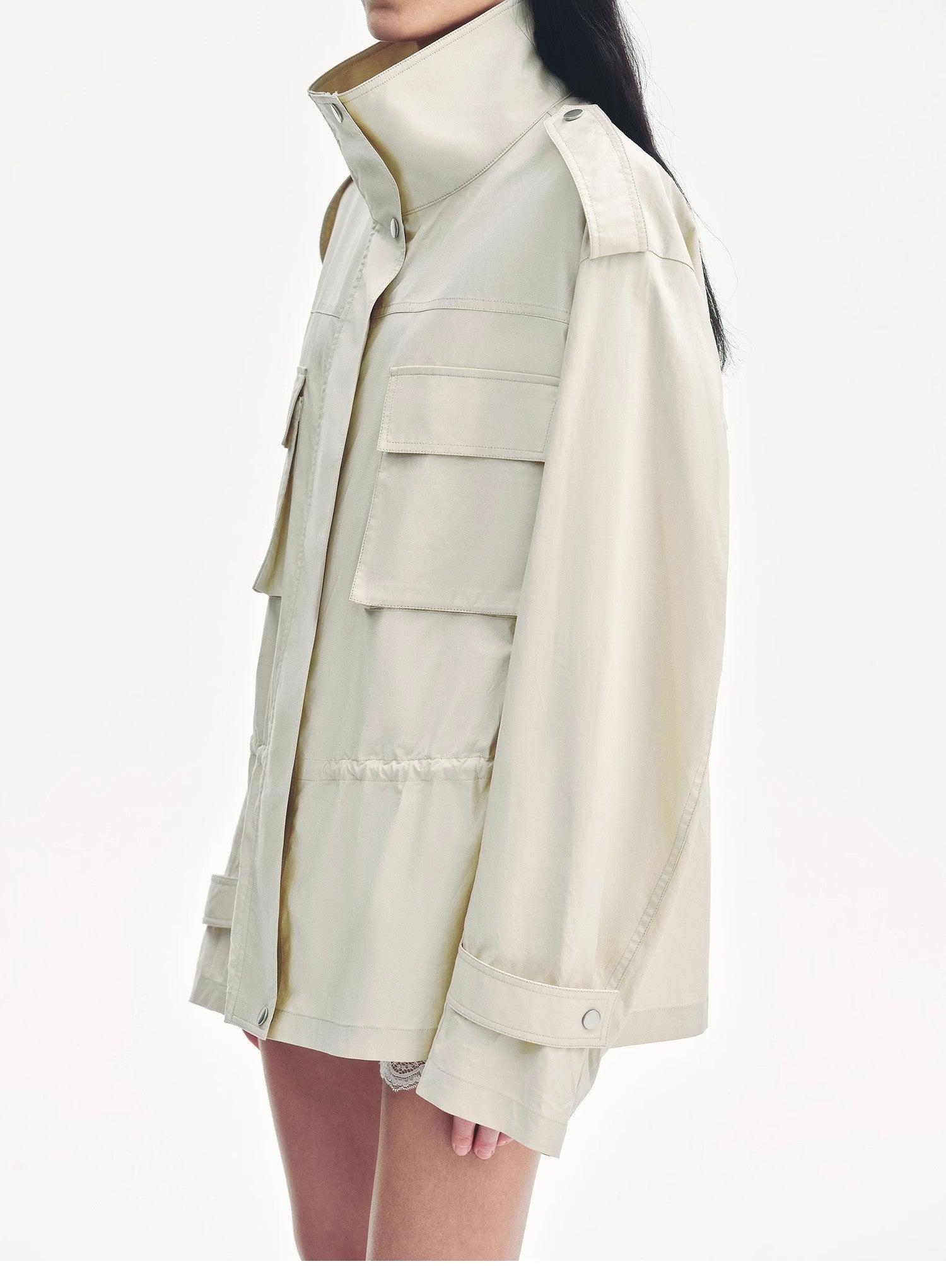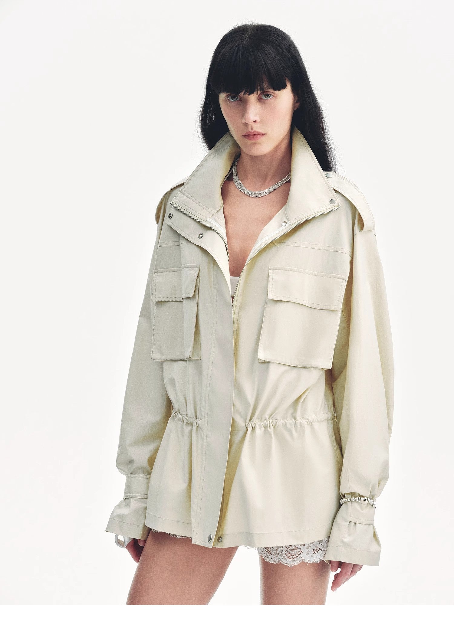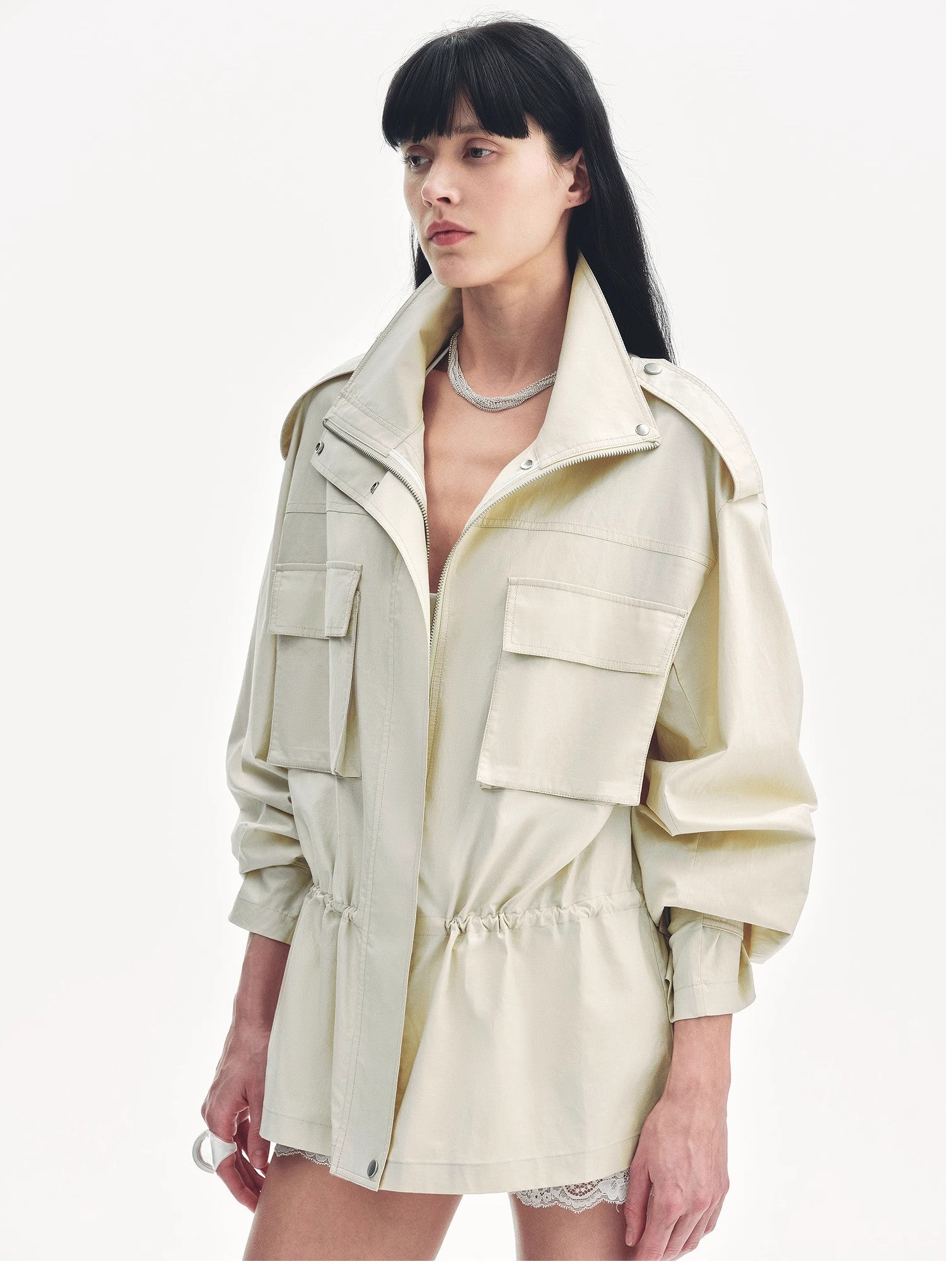 The loose-fitting body, combined with the drawstring waist design, offers more adjustability. You can freely adjust the silhouette to create a personalized outfit style. The stand-up turn-down collar provides sun protection for the neck while enhancing the overall look. The multiple-pocket design is highly practical for outdoor activities and adds an aesthetic touch of utility style.