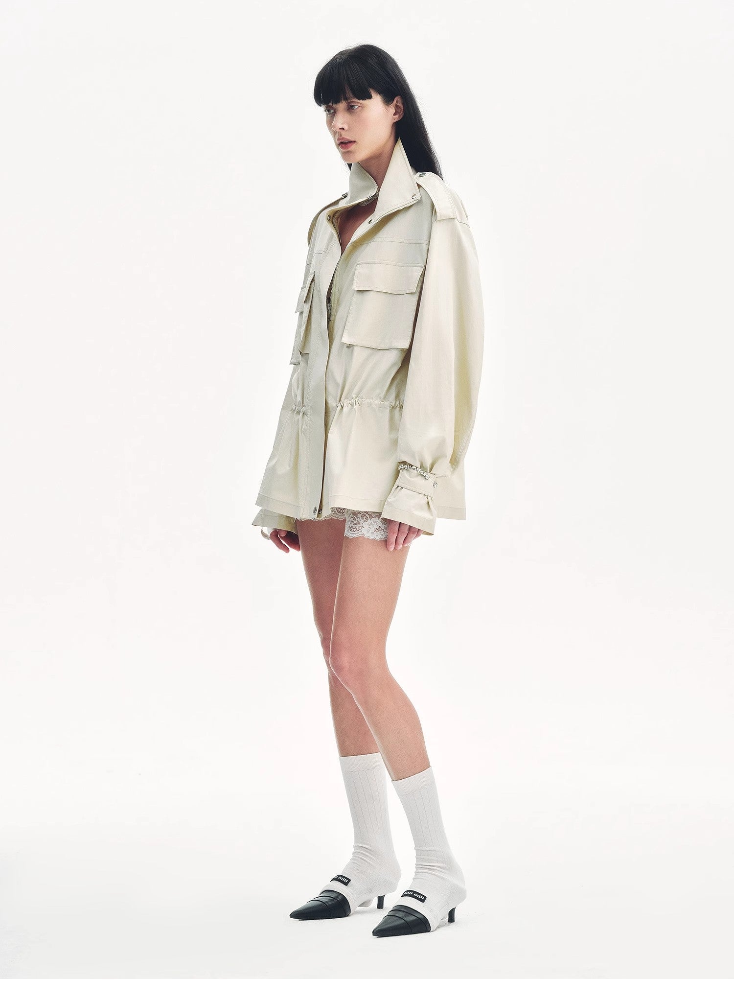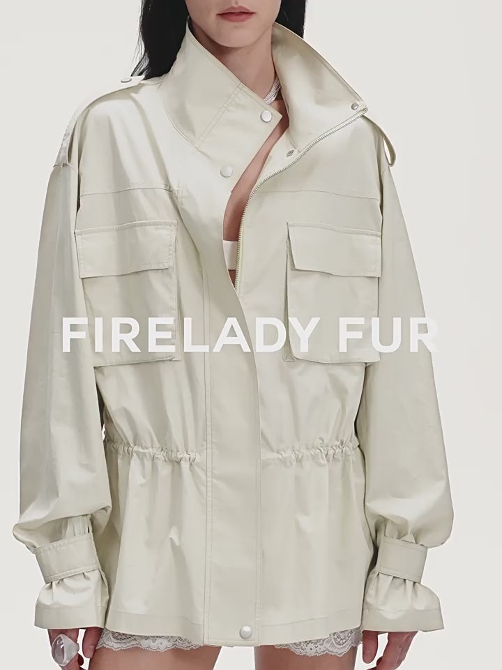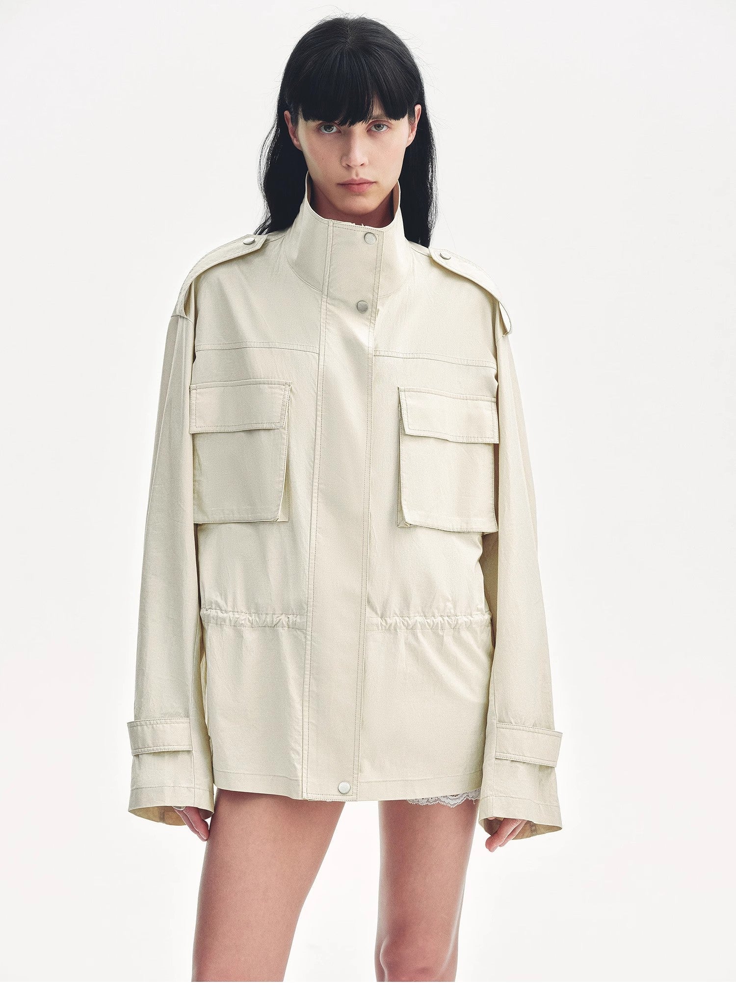 The loose-fitting body, combined with the drawstring waist design, offers more adjustability. You can freely adjust the silhouette to create a personalized outfit style. The stand-up turn-down collar provides sun protection for the neck while enhancing the overall look. The multiple-pocket design is highly practical for outdoor activities and adds an aesthetic touch of utility style.