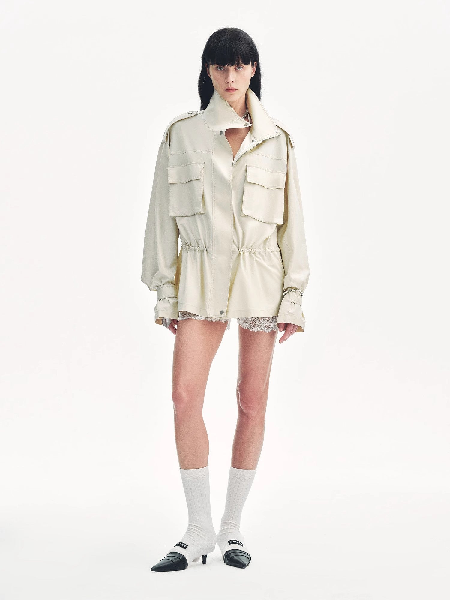Utility-style with pocketed stand-up turn-down collar and drawstring waist