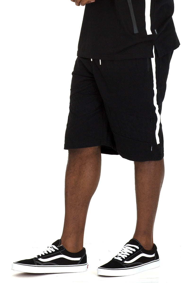 This short sleeve and short hoodie set includes a quarter zip hoodie with drawstrings and elastic waist band short. With a bold white stripe on the side of both top and bottom. Staple piece to any closet. Light weight and comfortable fabric- easy to wear every day and for active activities.
